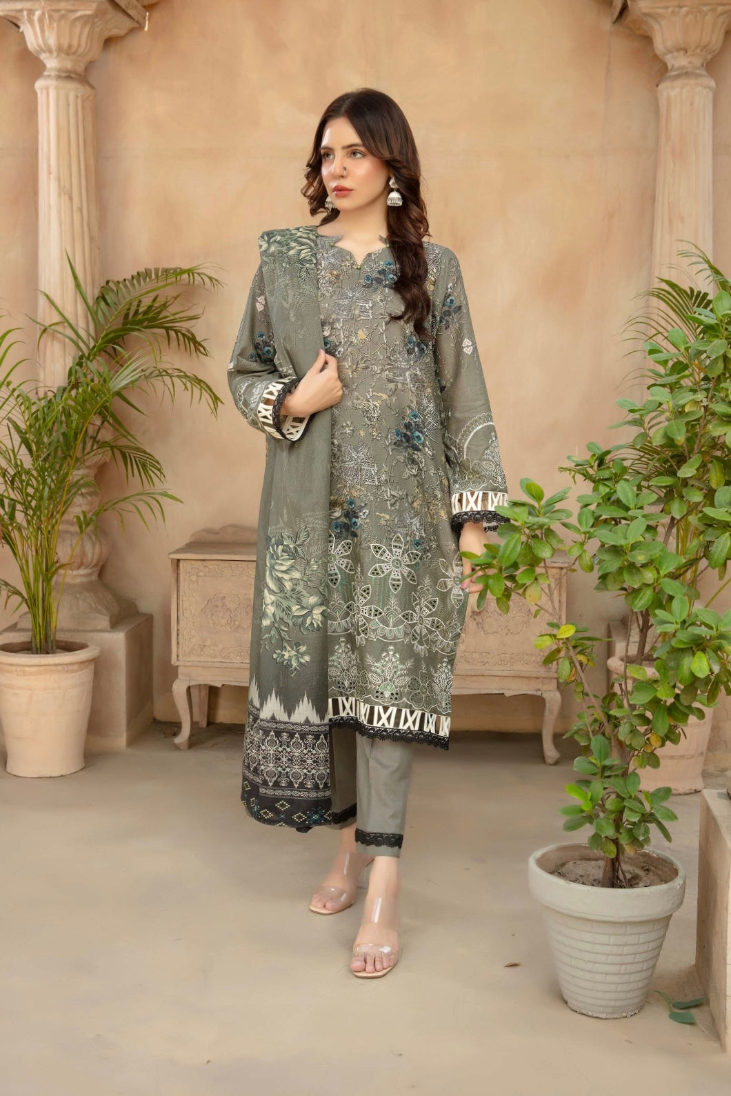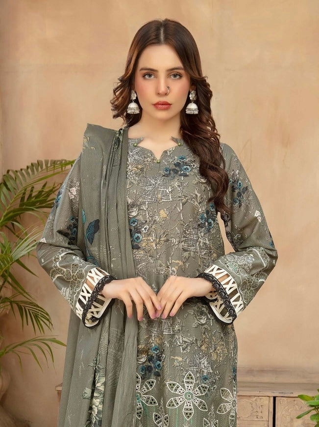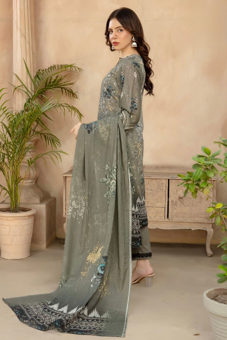 Fabric: Digital Printed Lawn Shirts with Embroidered Daman, Printed Lawn Dupatta, Plain Cotton Trouser