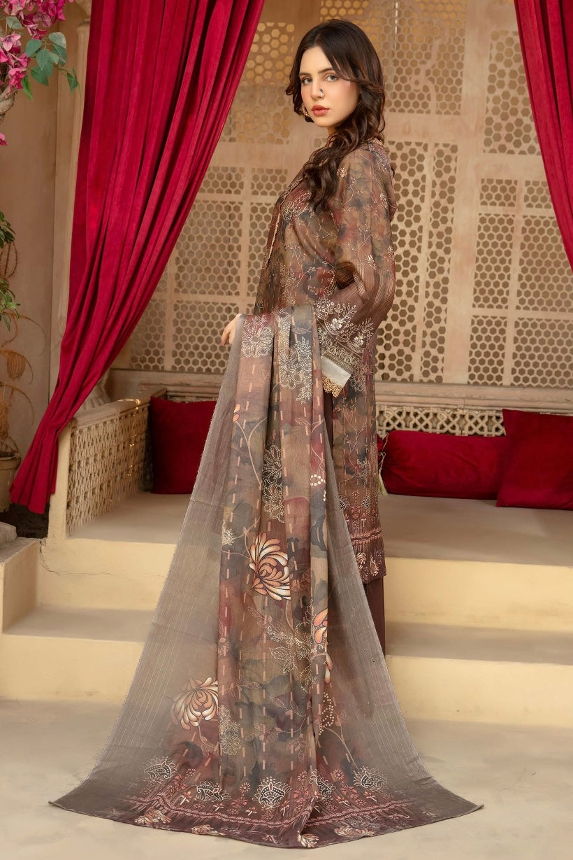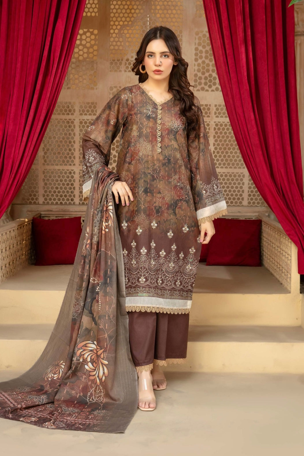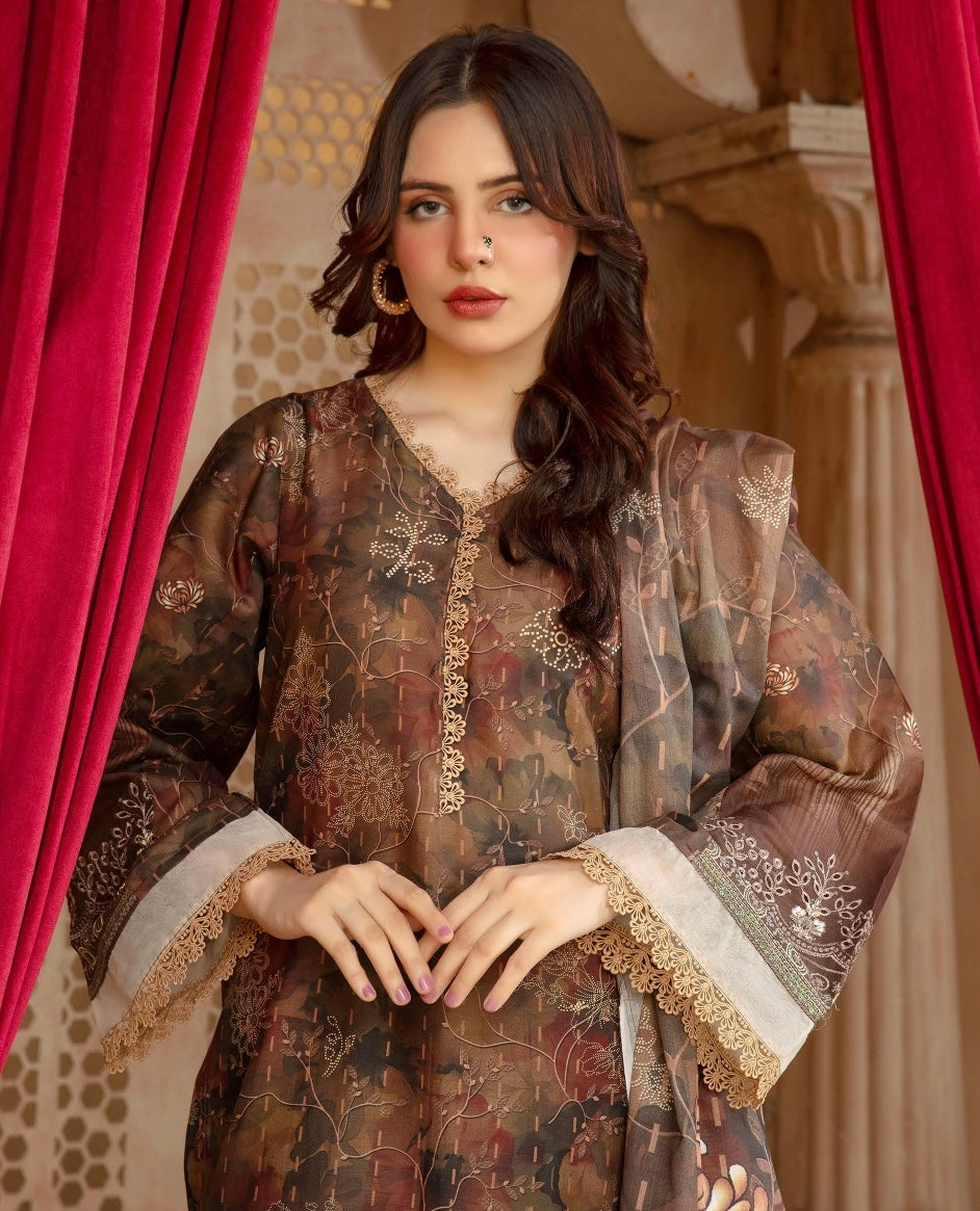 Fabric: Digital Printed Lawn Shirts with Embroidered Daman, Printed Lawn Dupatta, Plain Cotton Trouser