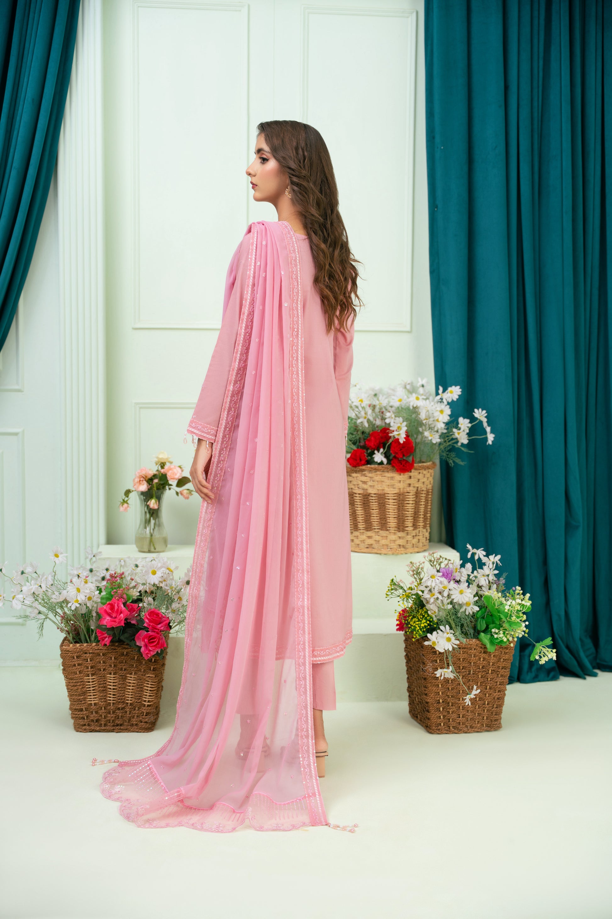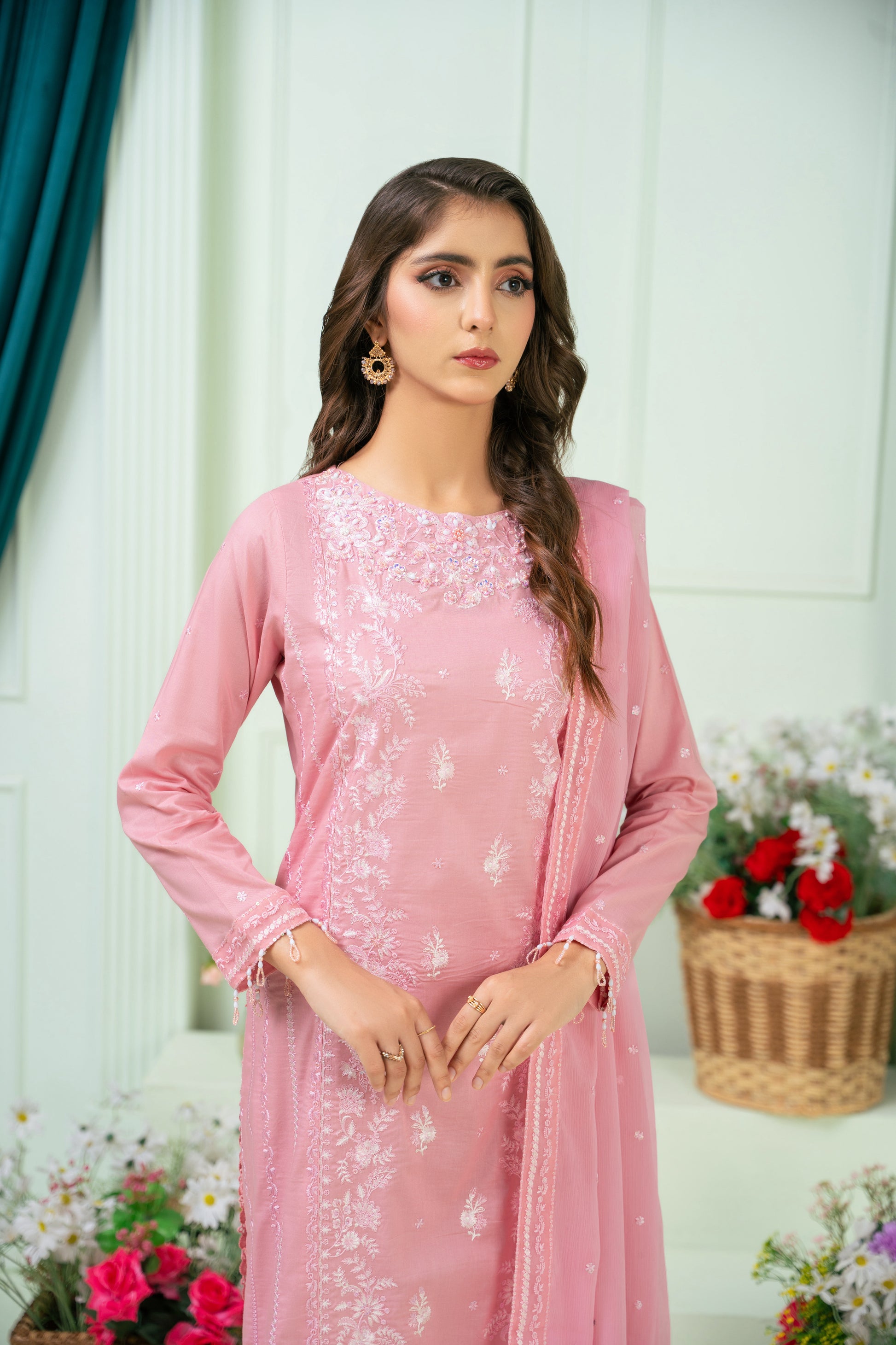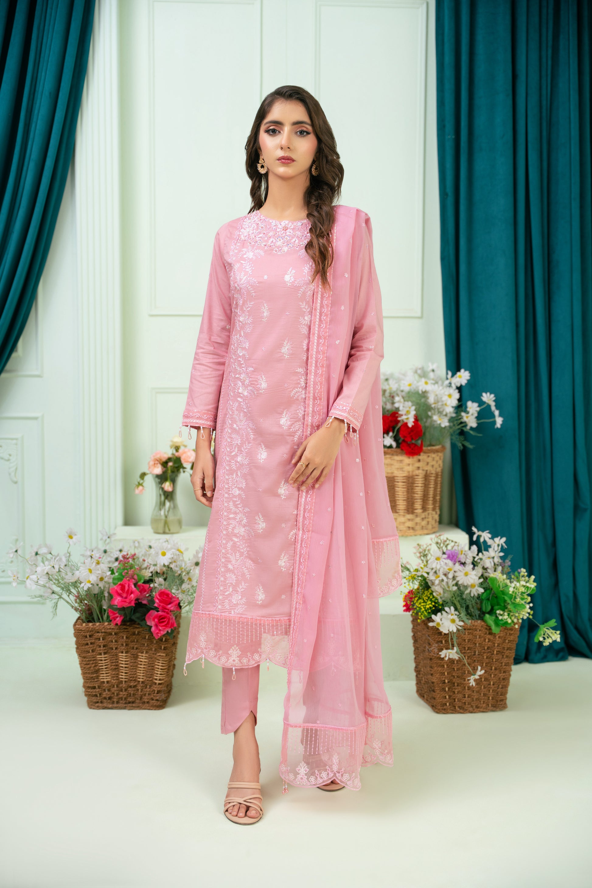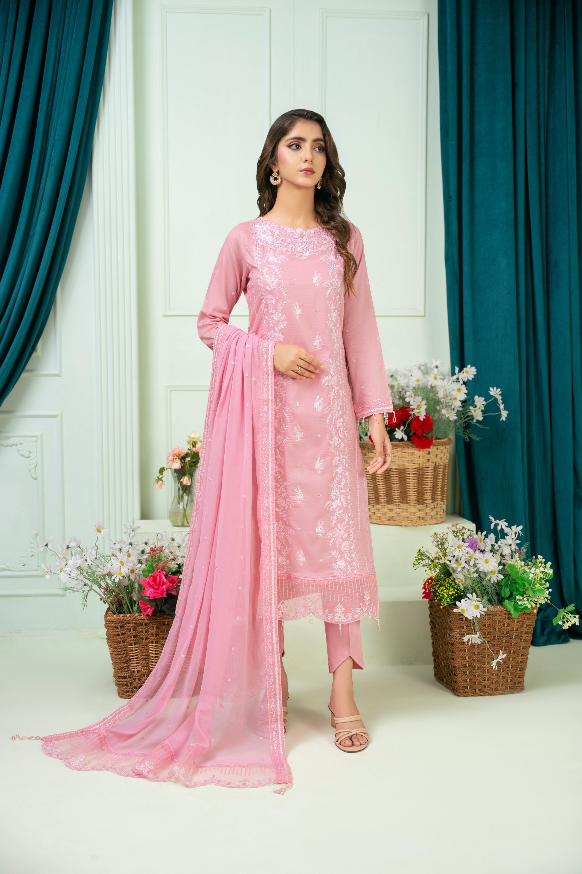 Fabric: Embroidered Cotton Shirt with Hand-Embellishments, Embroidered Chiffon dupatta with Organza Pallu, Plain Cotton trouser