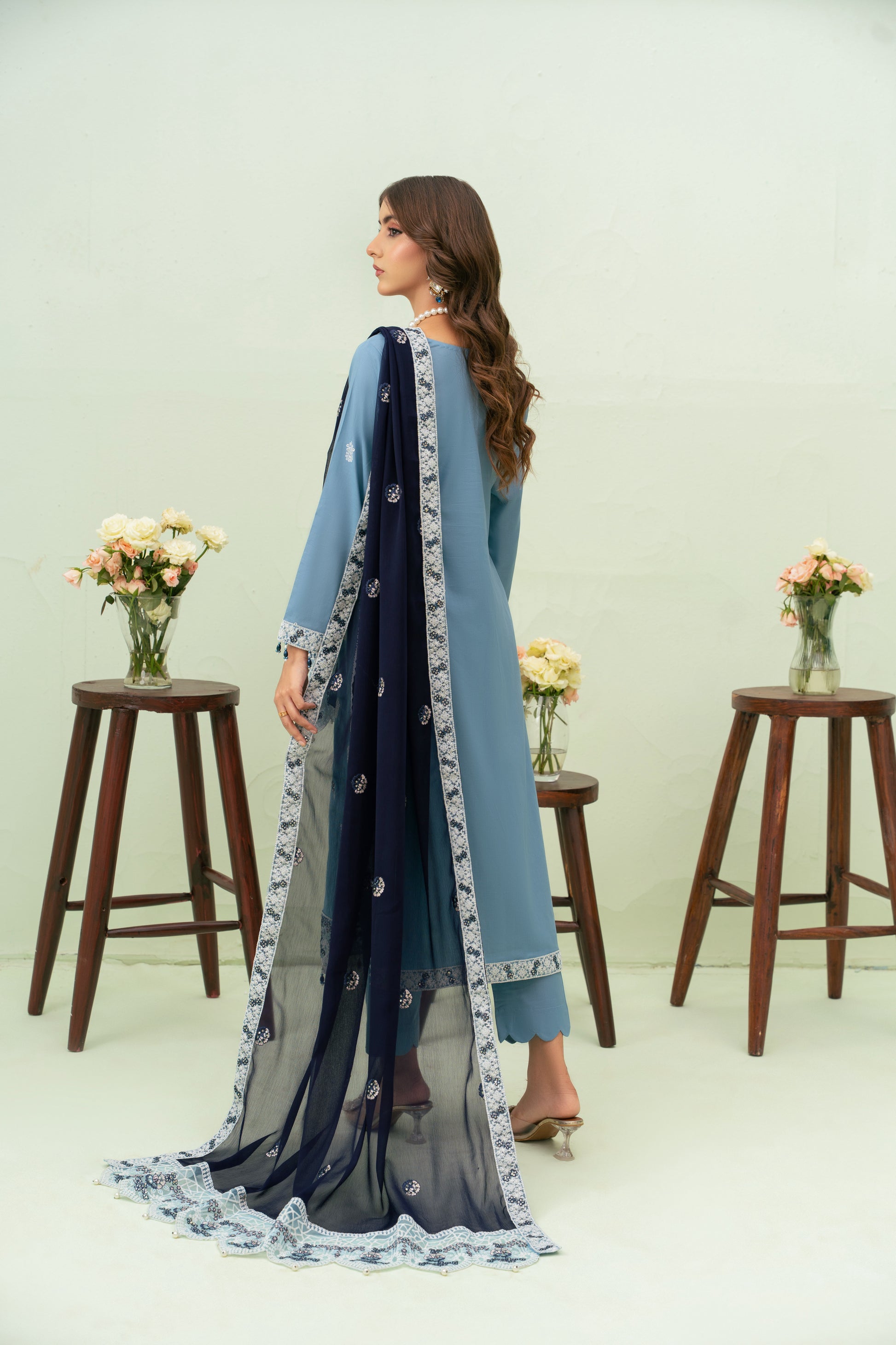 Fabric: Embroidered Cotton Chicken Kaari Shirt with Hand-Embellishments, Embroidered Chiffon dupatta with Organza Pallu, Plain Cotton trouser