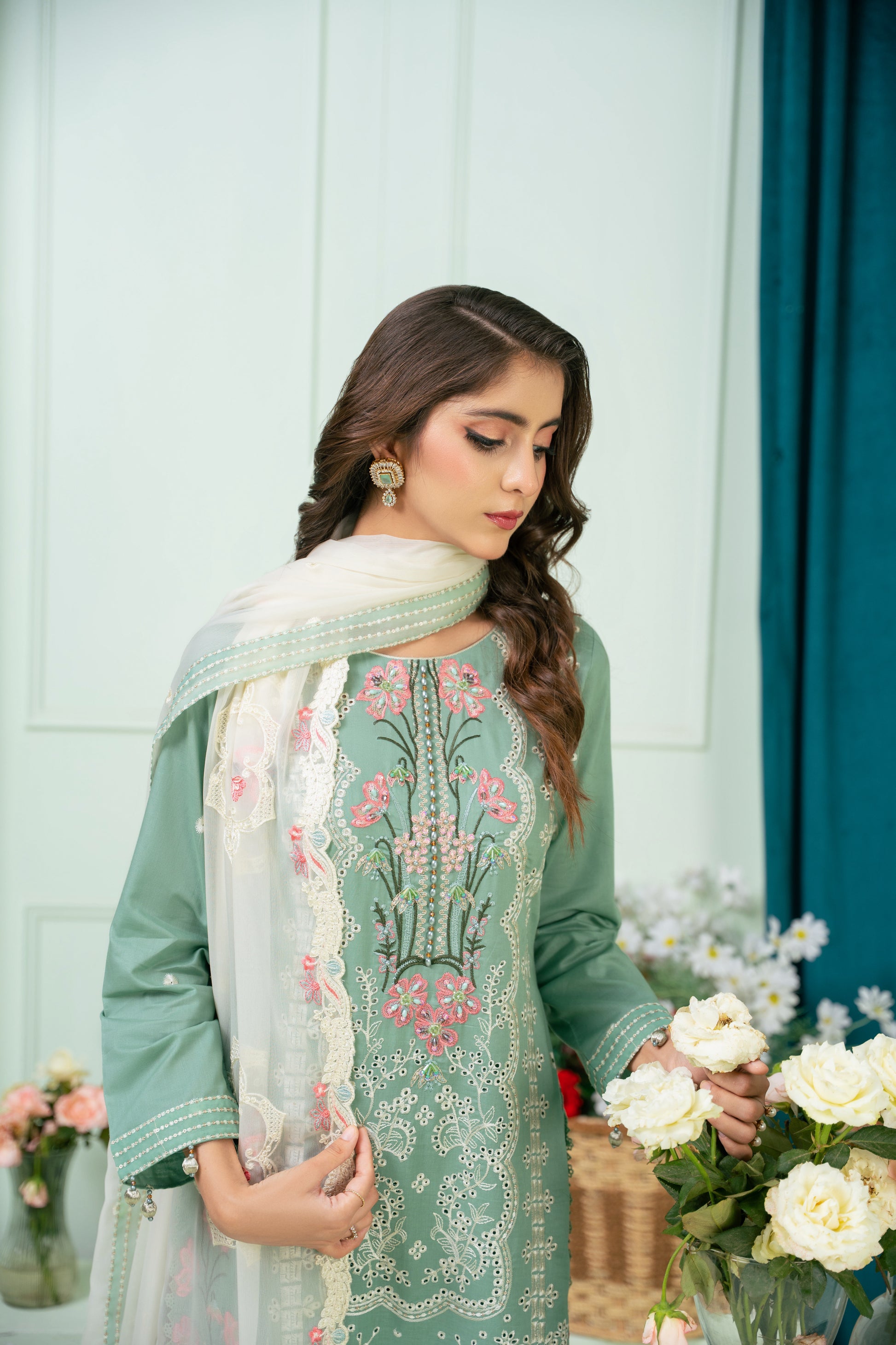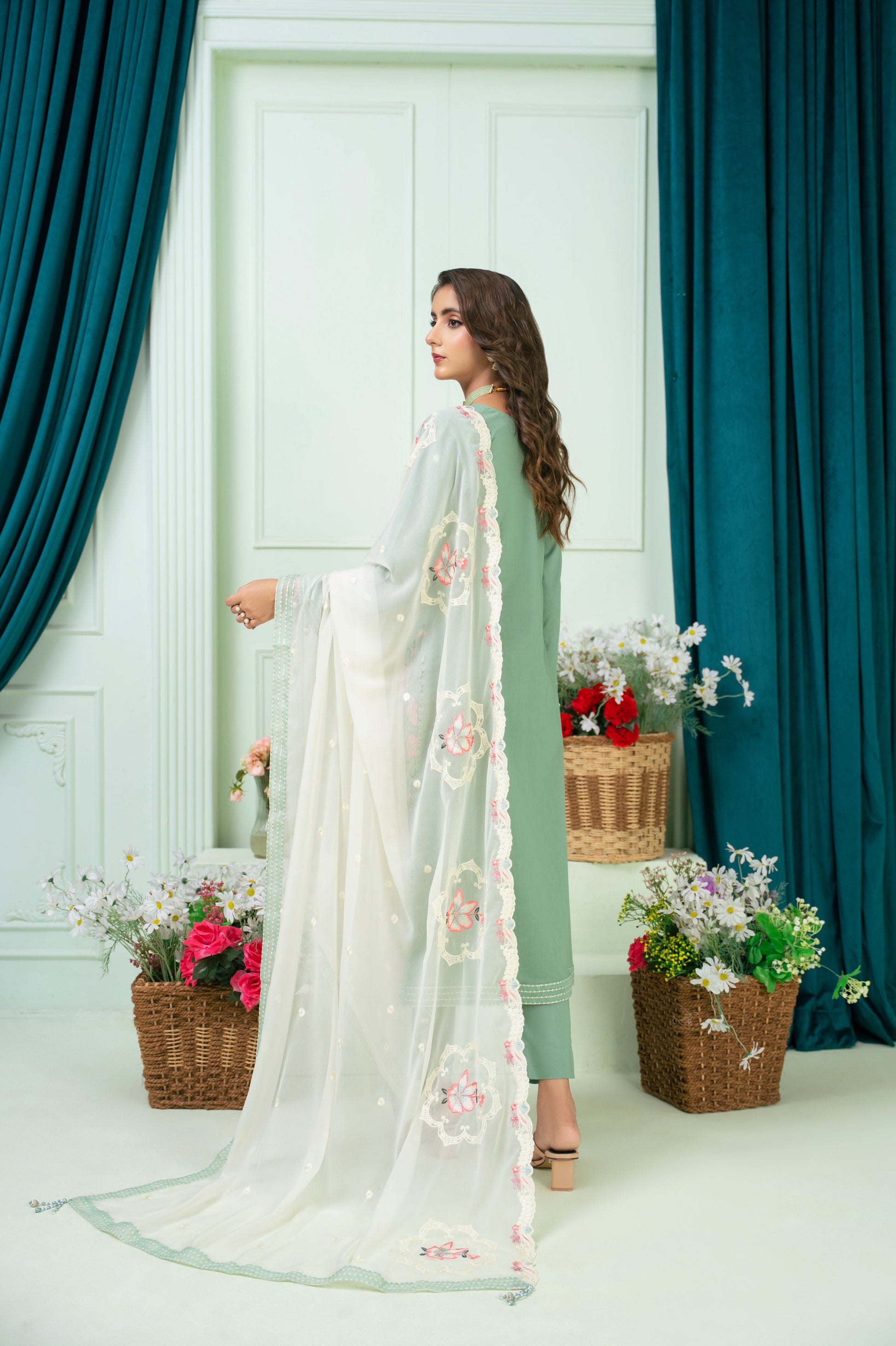Fabric: Embroidered Cotton Chicken Kaari Shirt with Hand-Embellishments, Embroidered Chiffon dupatta, Plain Cotton trouser