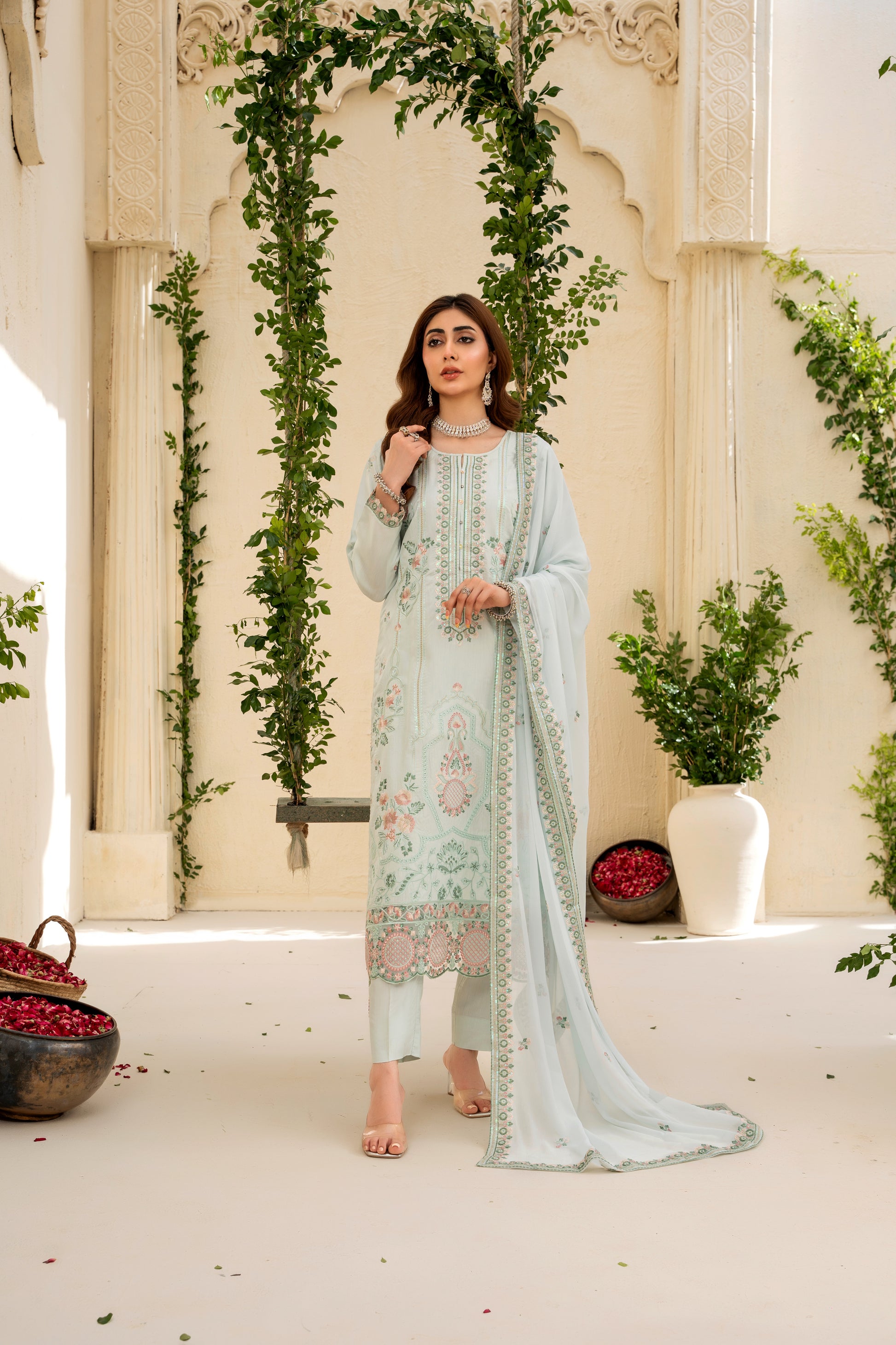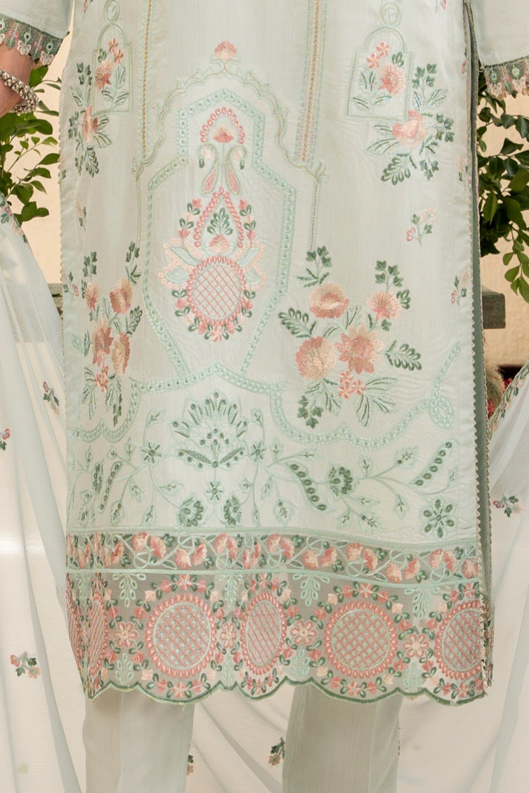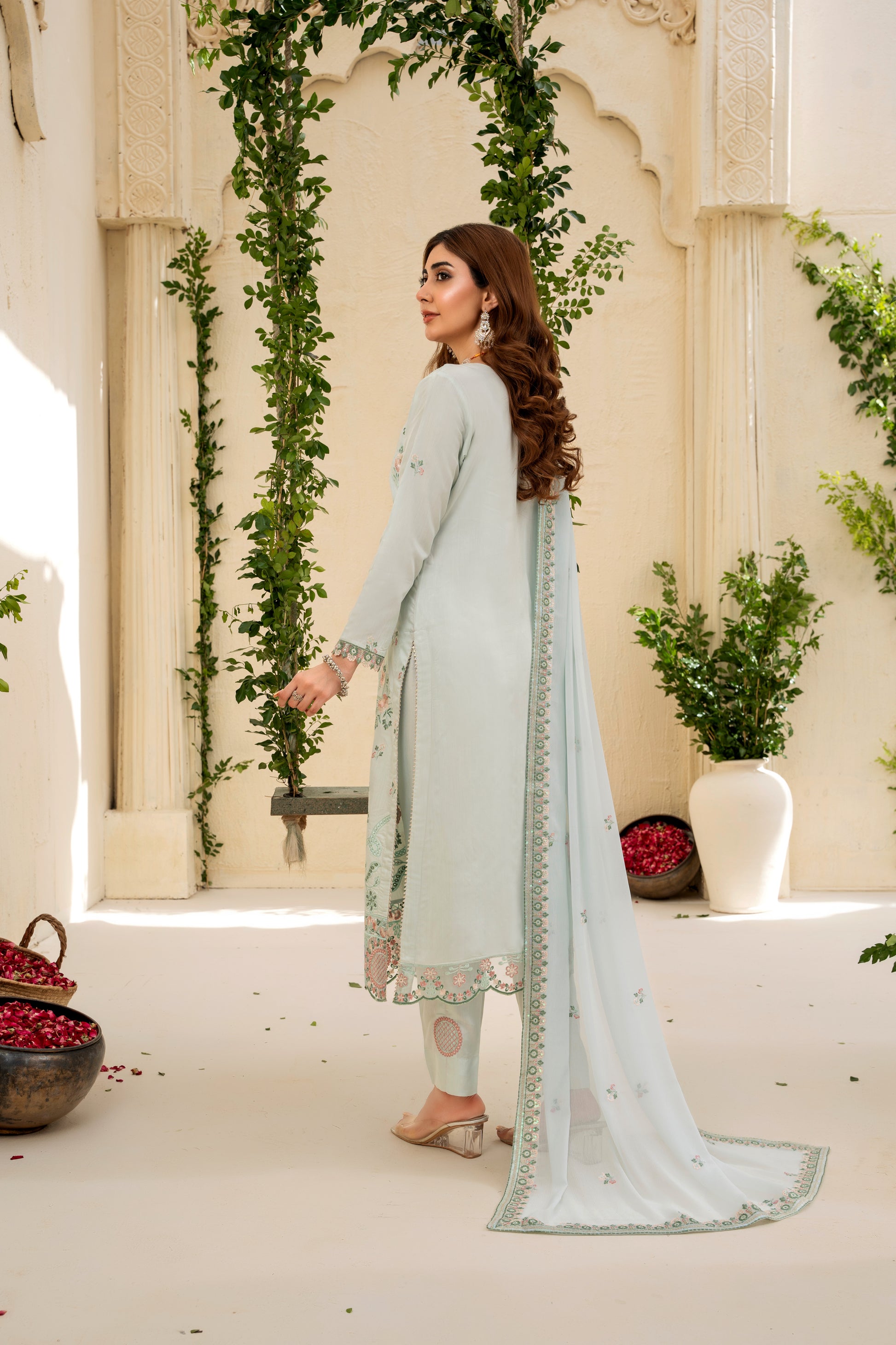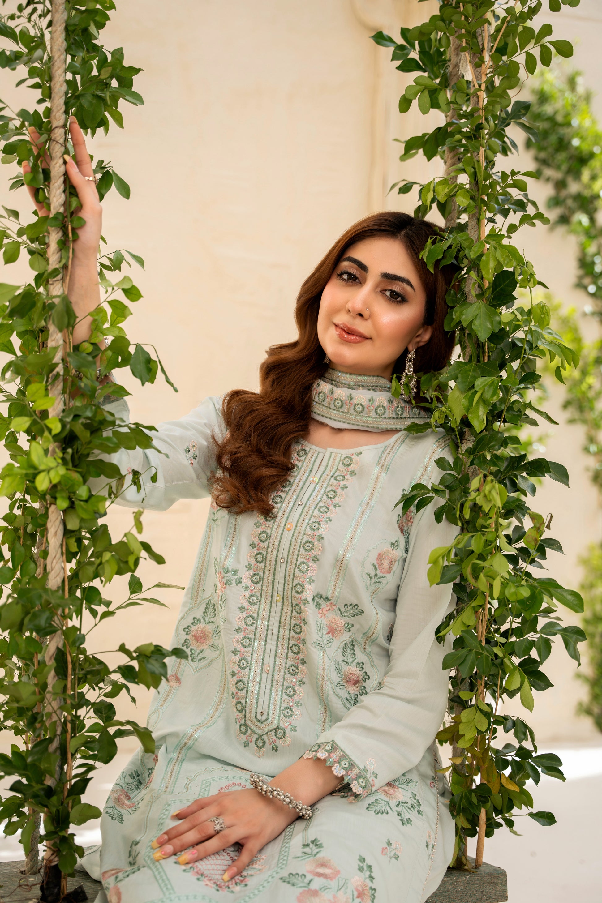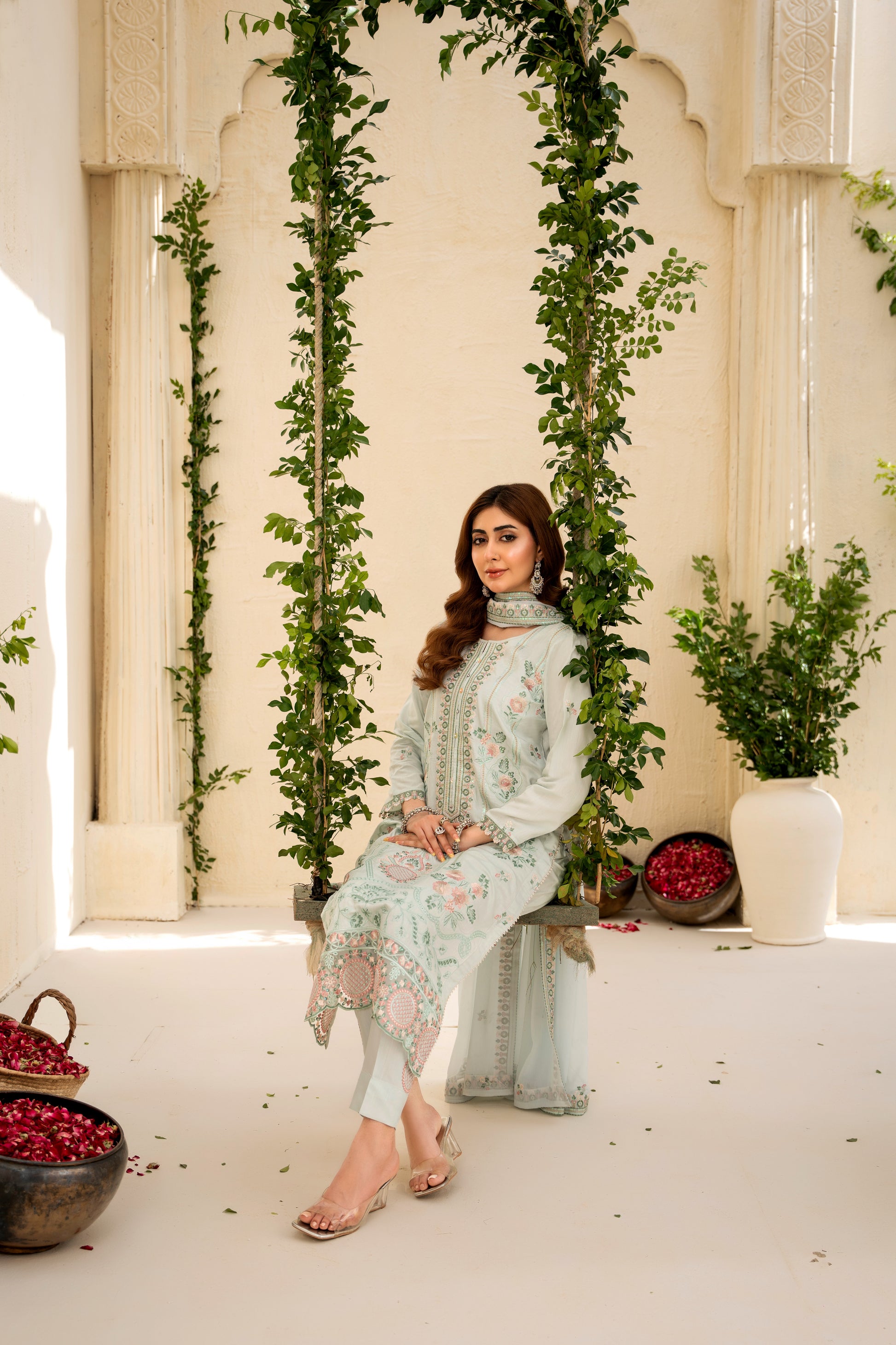 Fabric: Embroidered Viscose shirt with hand-made neckline, embroidered matha-patti cutwork Chiffon dupatta, plain Viscose trouser