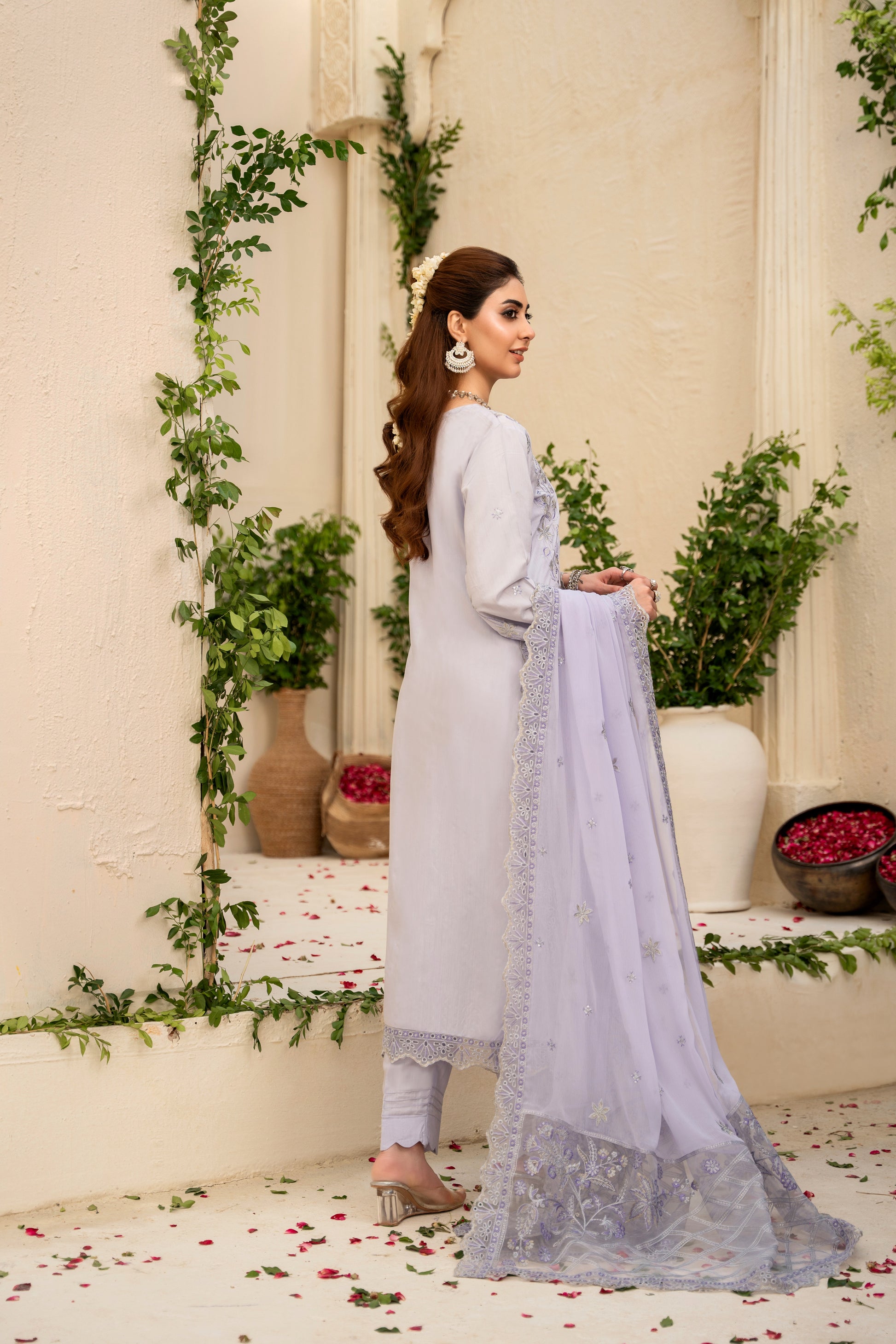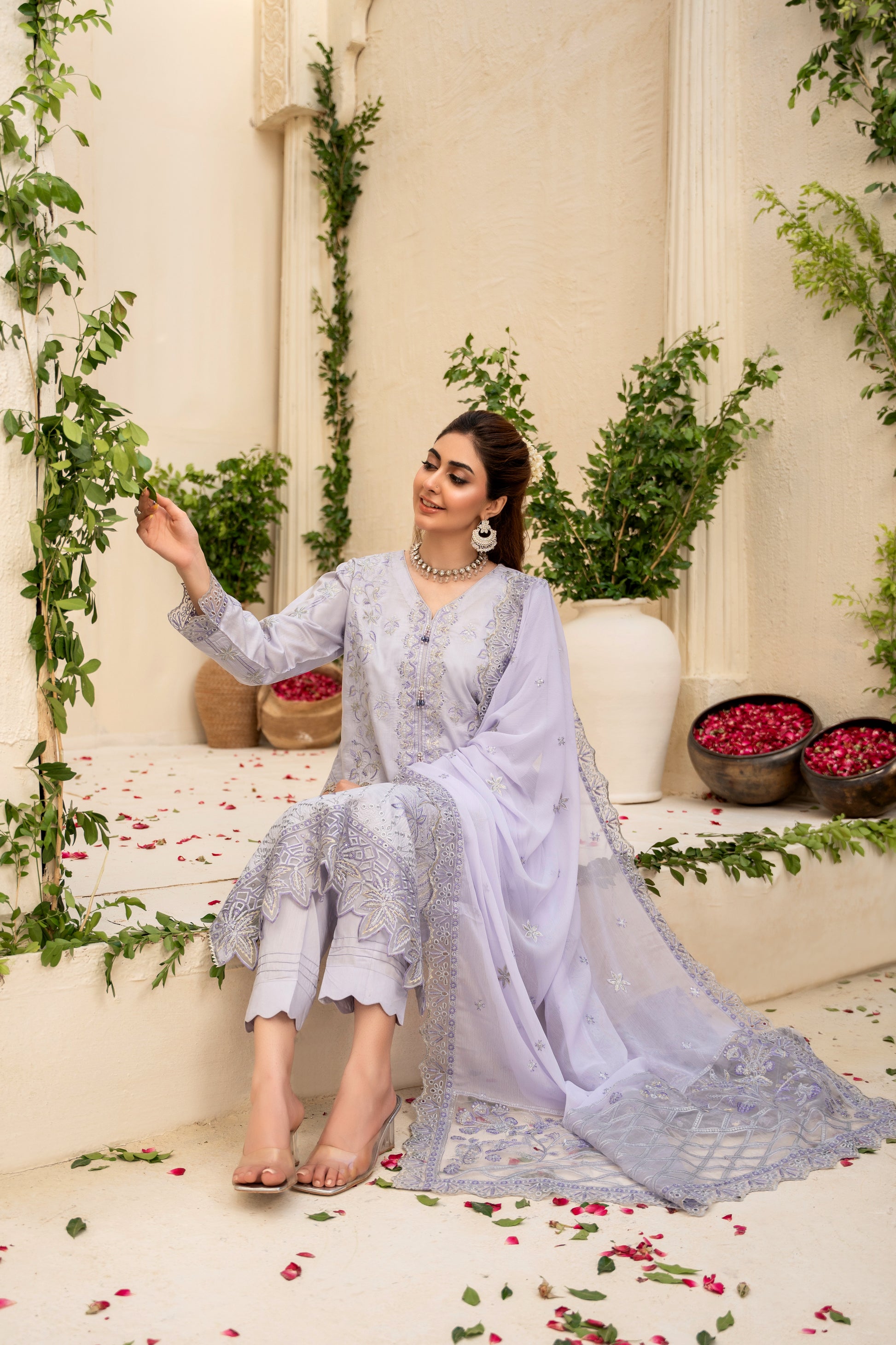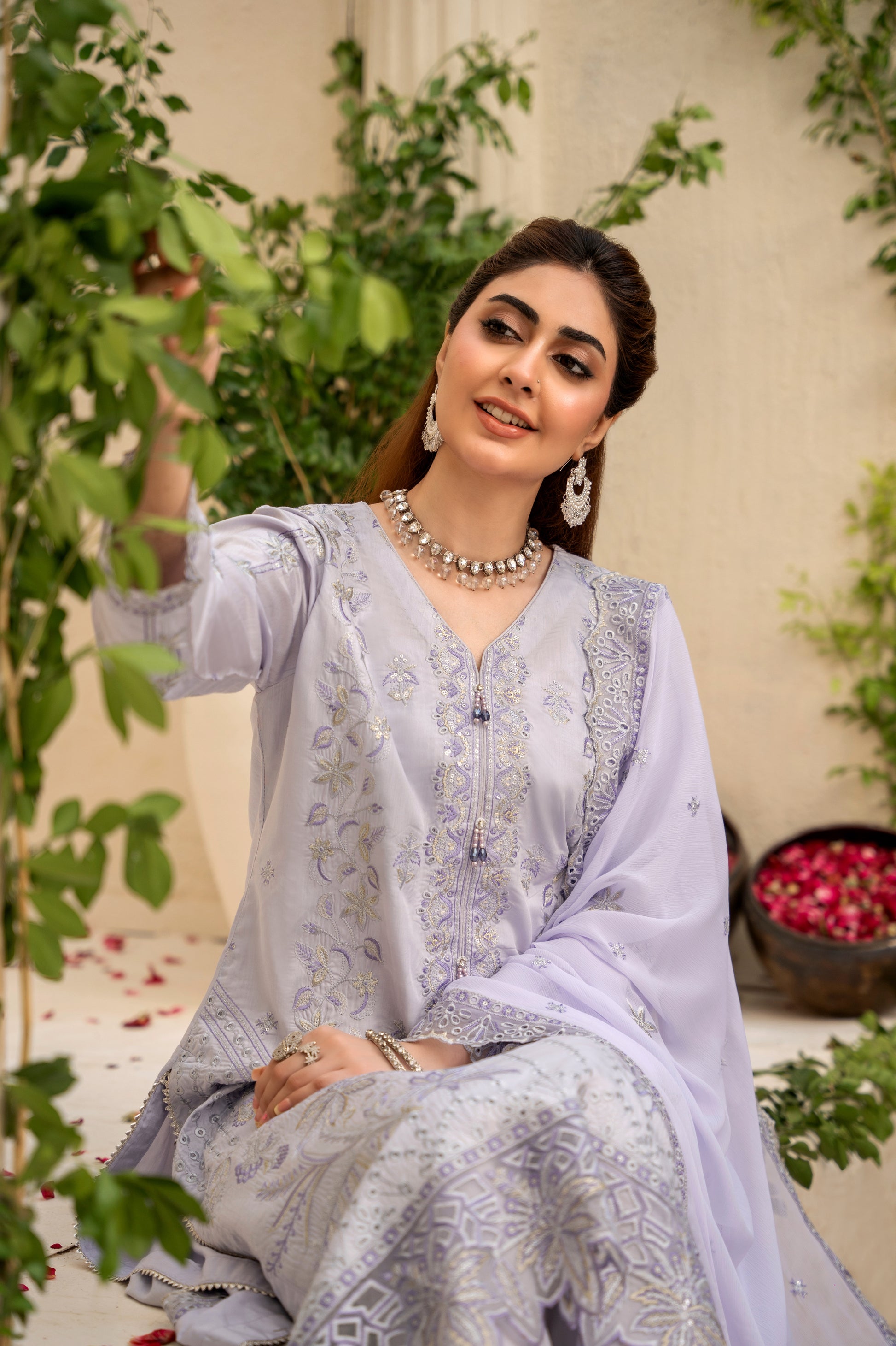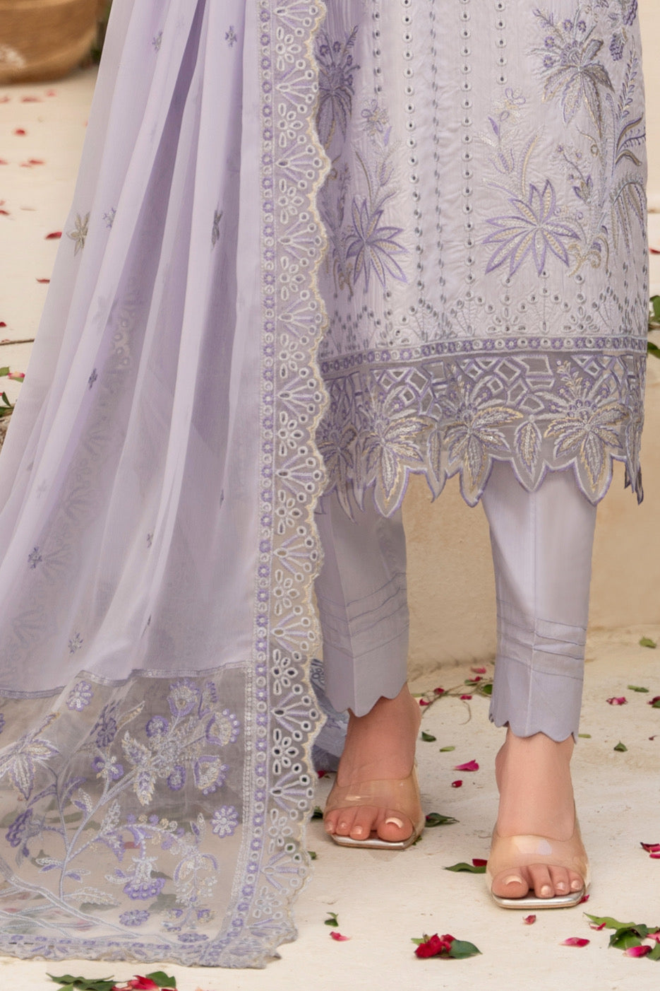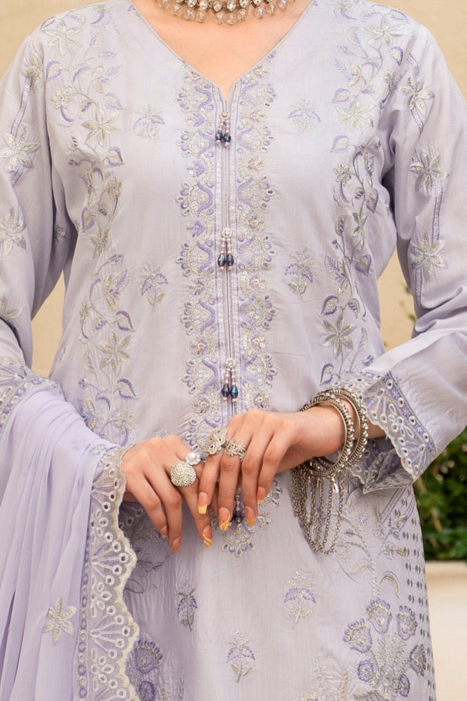 Fabric: Embroidered Viscose shirt with hand-made neckline, embroidered matha-patti cutwork Chiffon dupatta, plain Viscose trouser