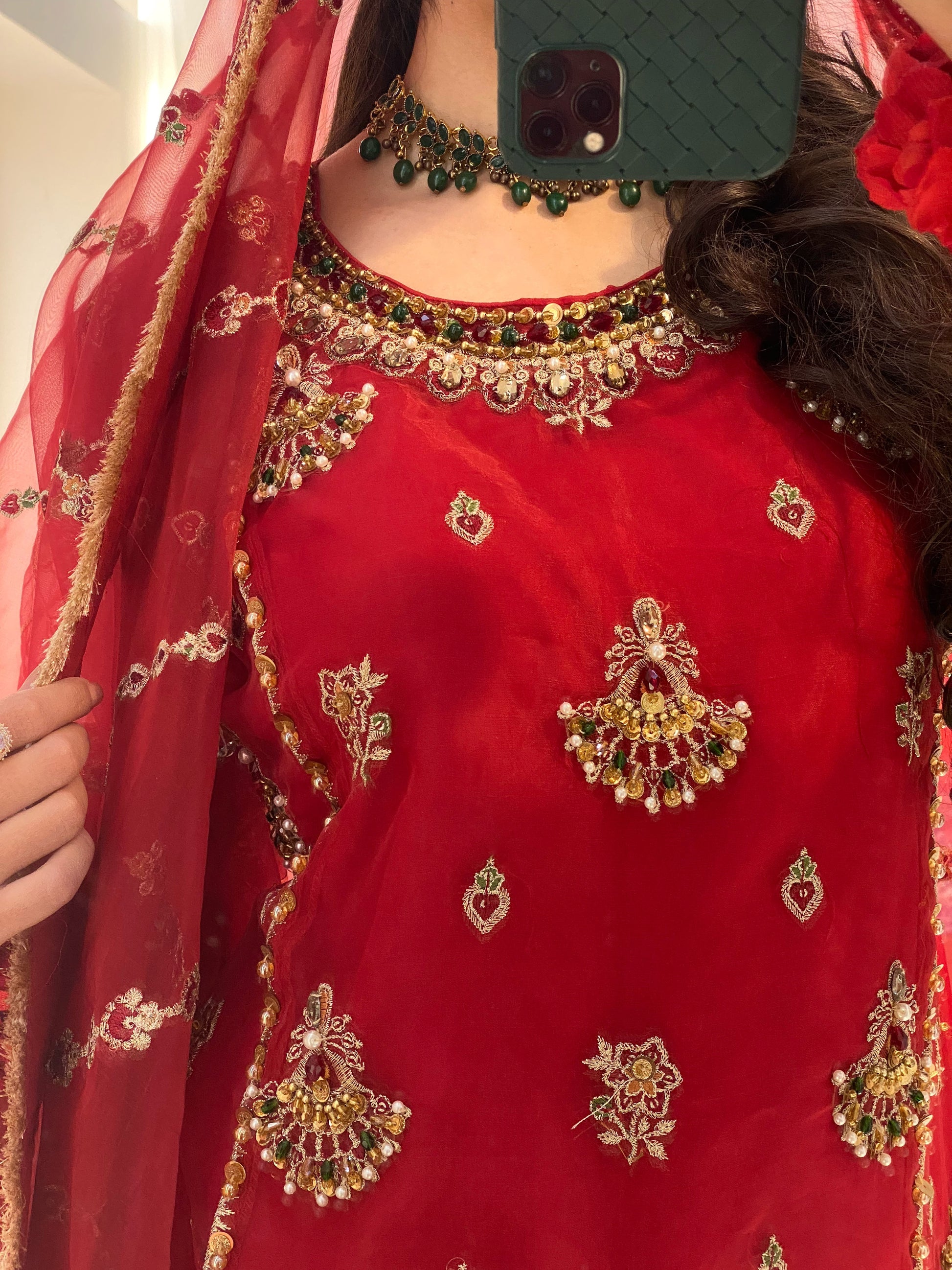 Colour: Rose Red / Fabric: Organza, Banarsi Jamawar
