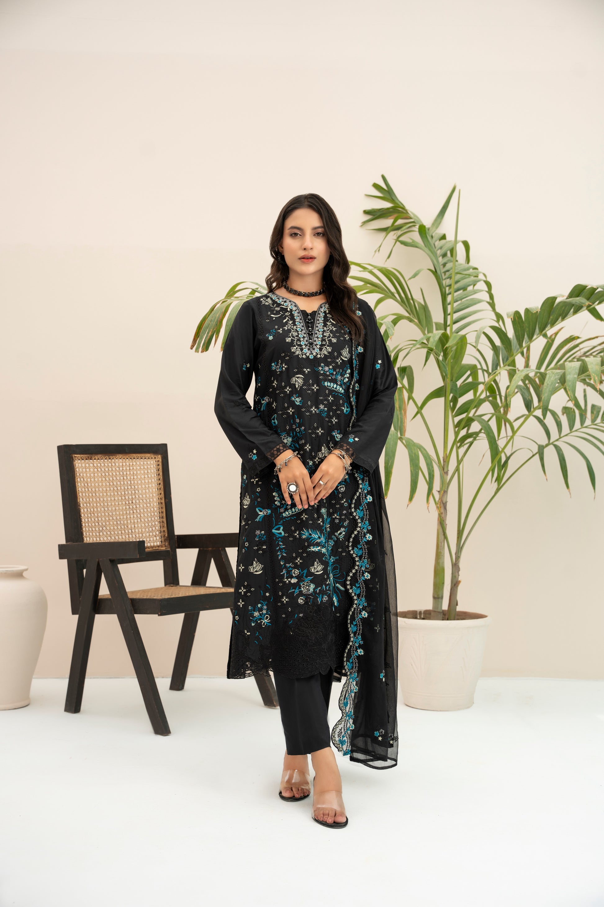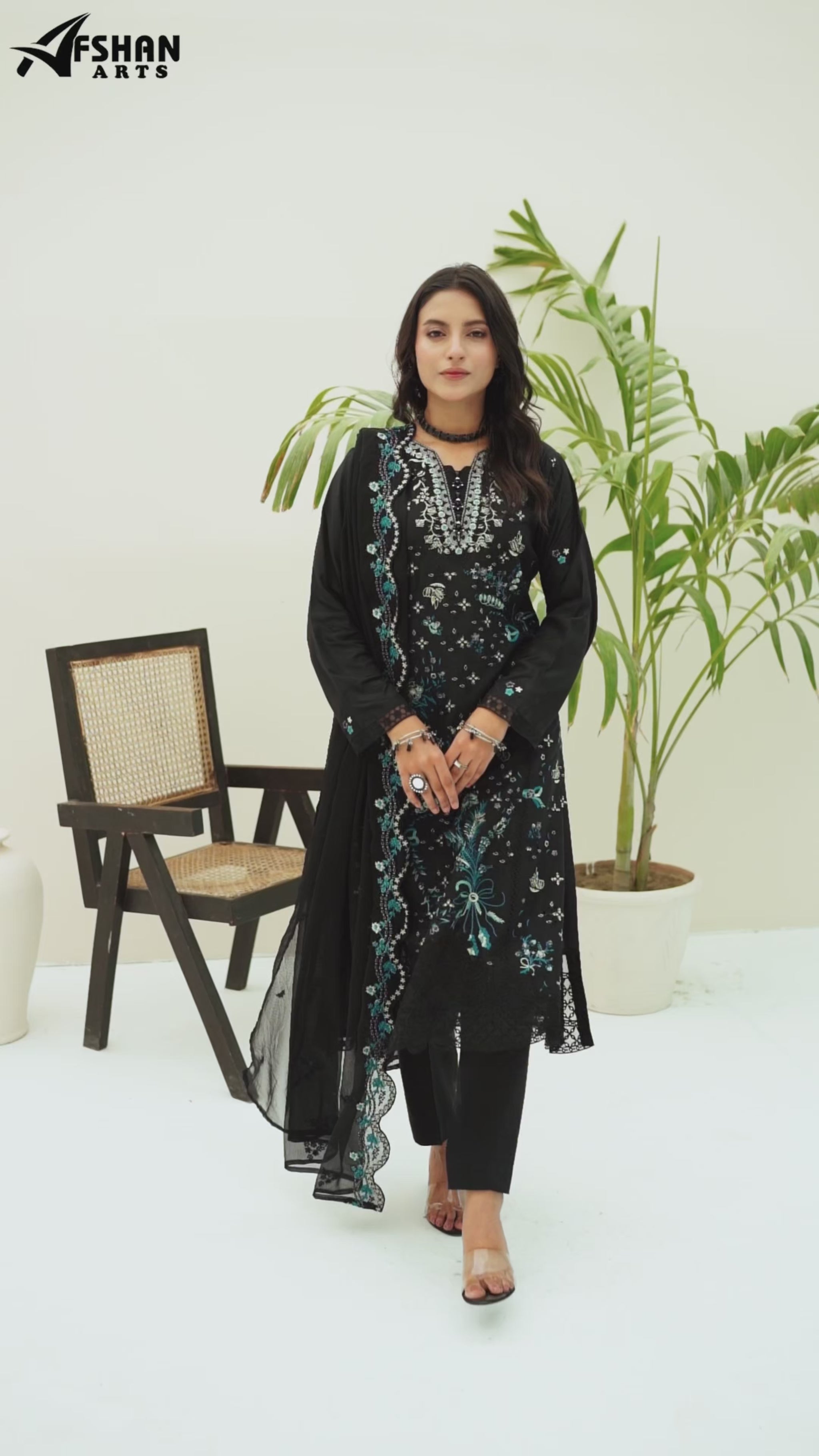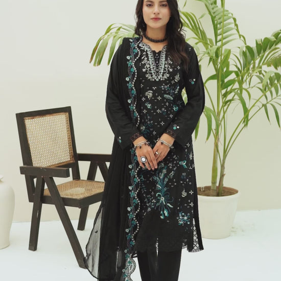Fabric: Embroidered Viscose shirt with hand-made neckline, embroidered matha-patti cutwork Chiffon dupatta, plain Viscose trouser
