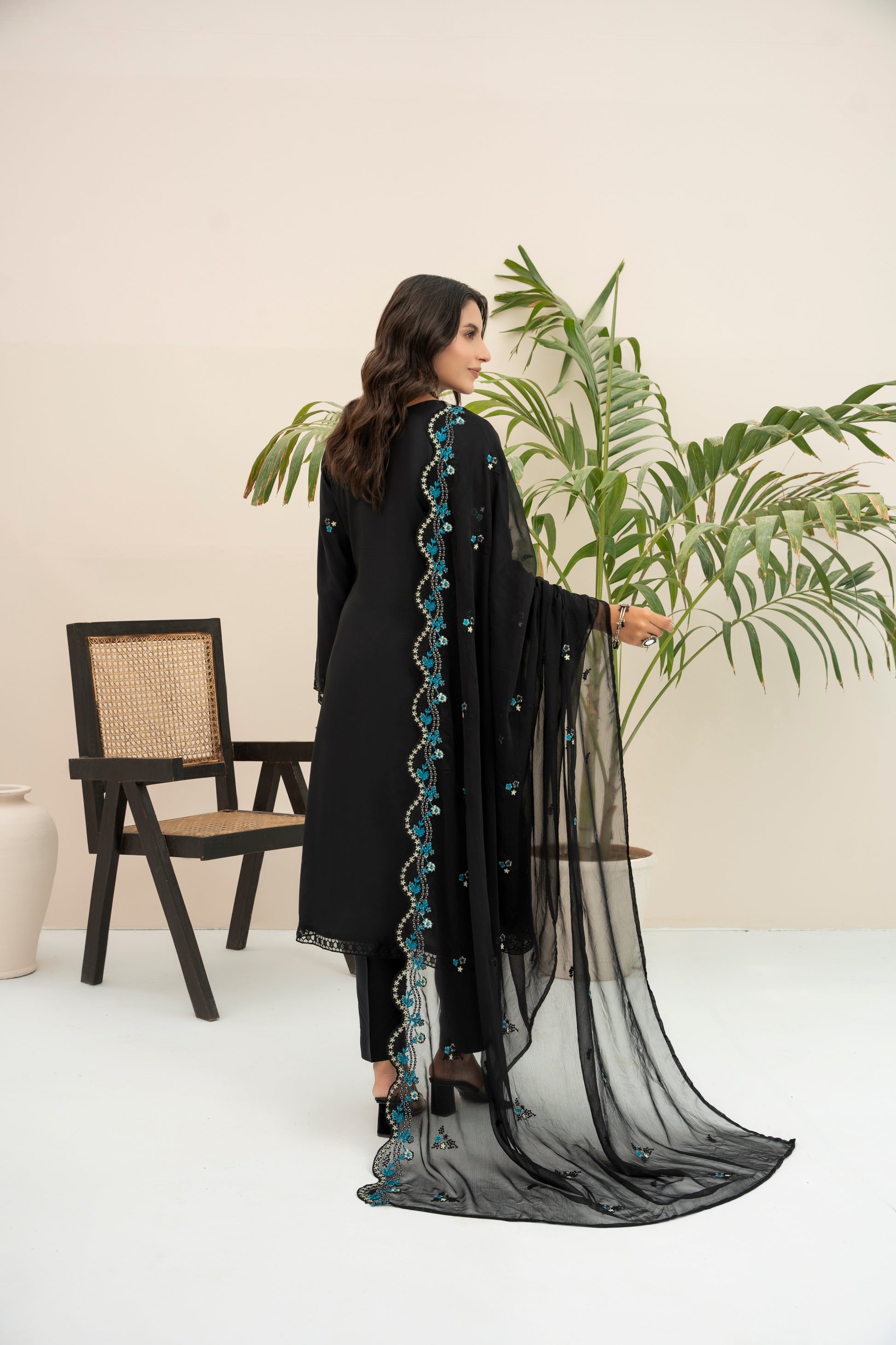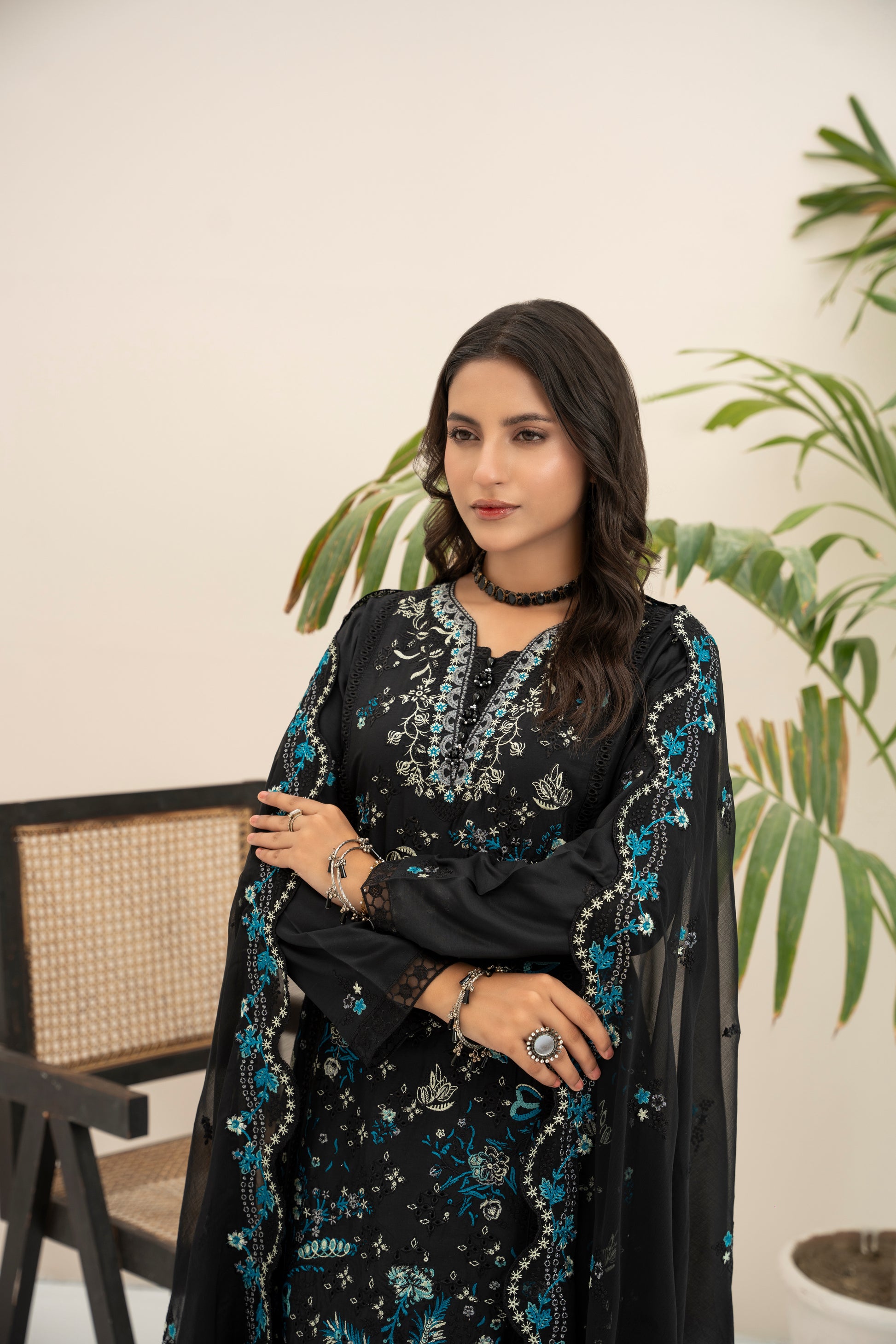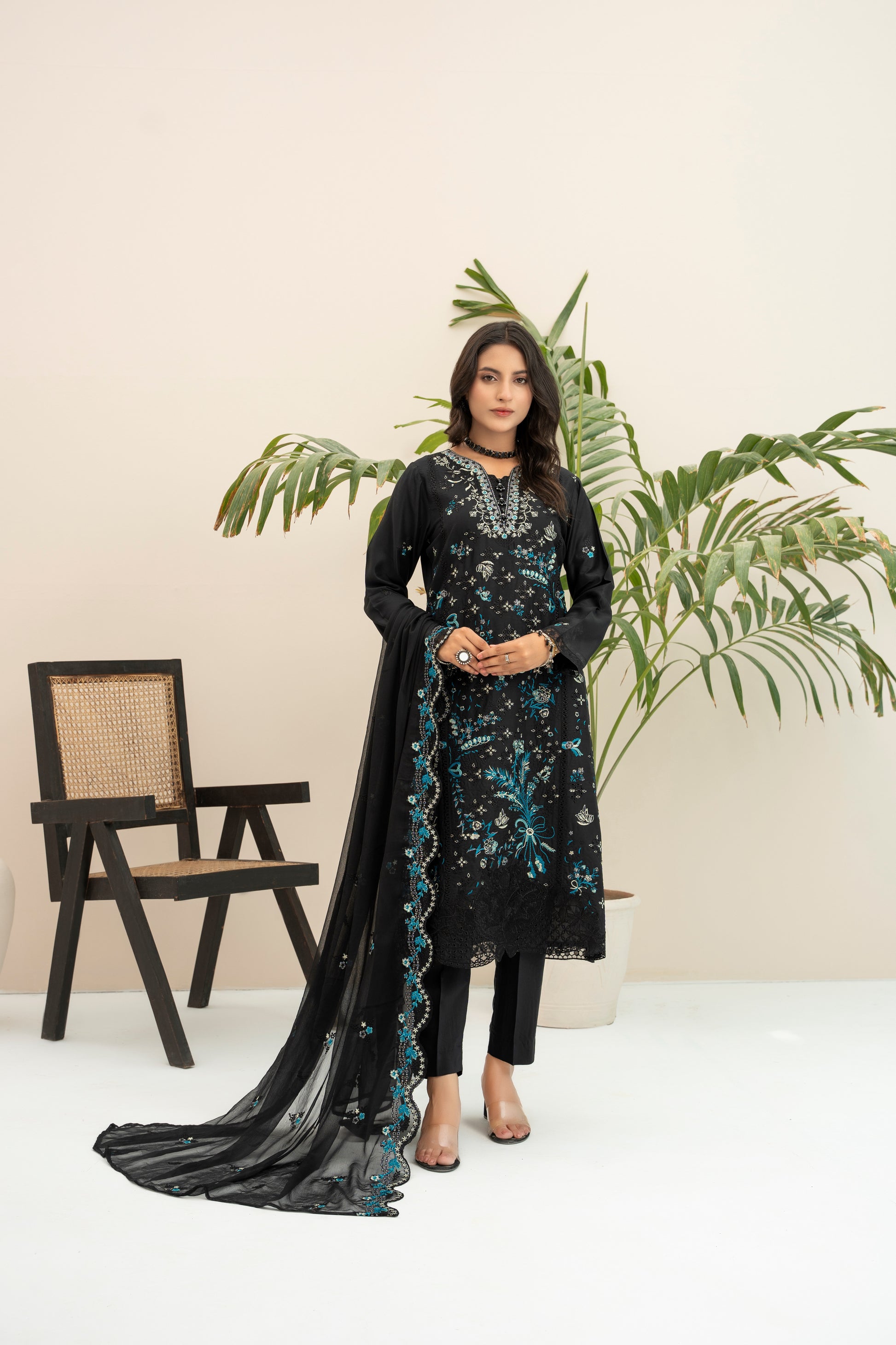 Fabric: Embroidered Viscose shirt with hand-made neckline, embroidered matha-patti cutwork Chiffon dupatta, plain Viscose trouser