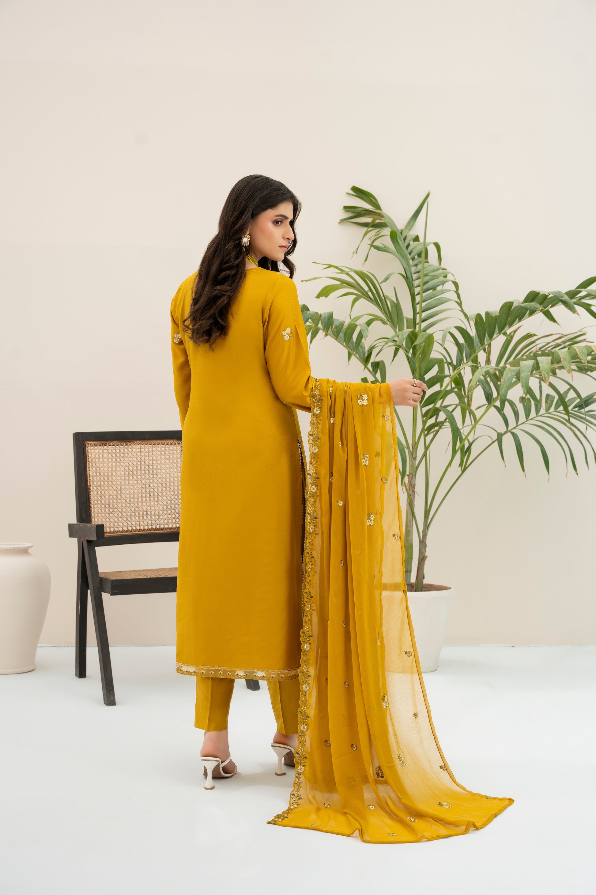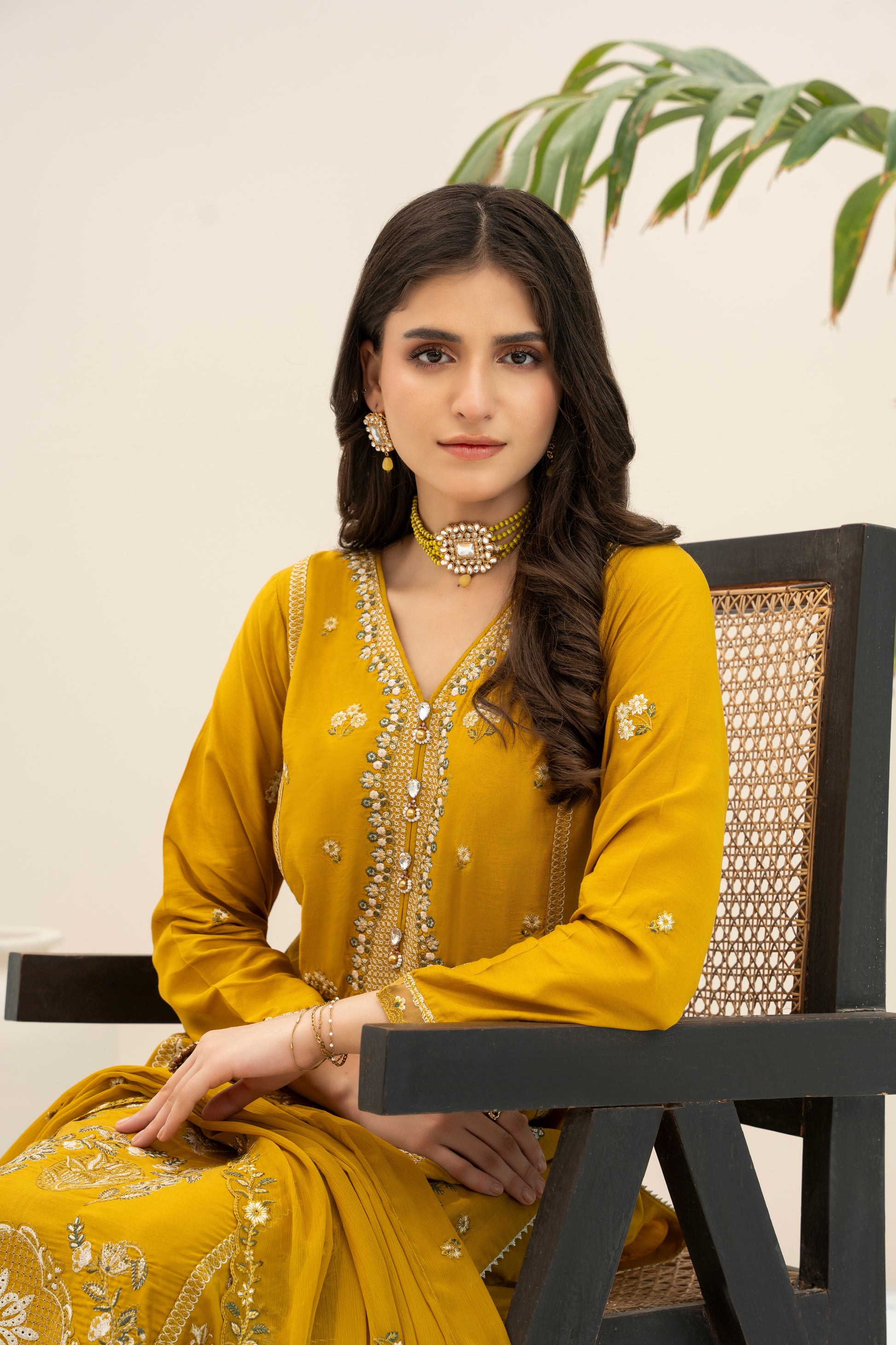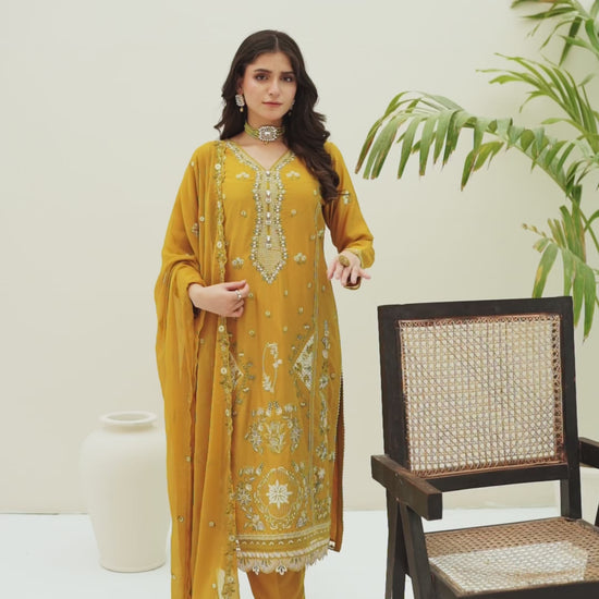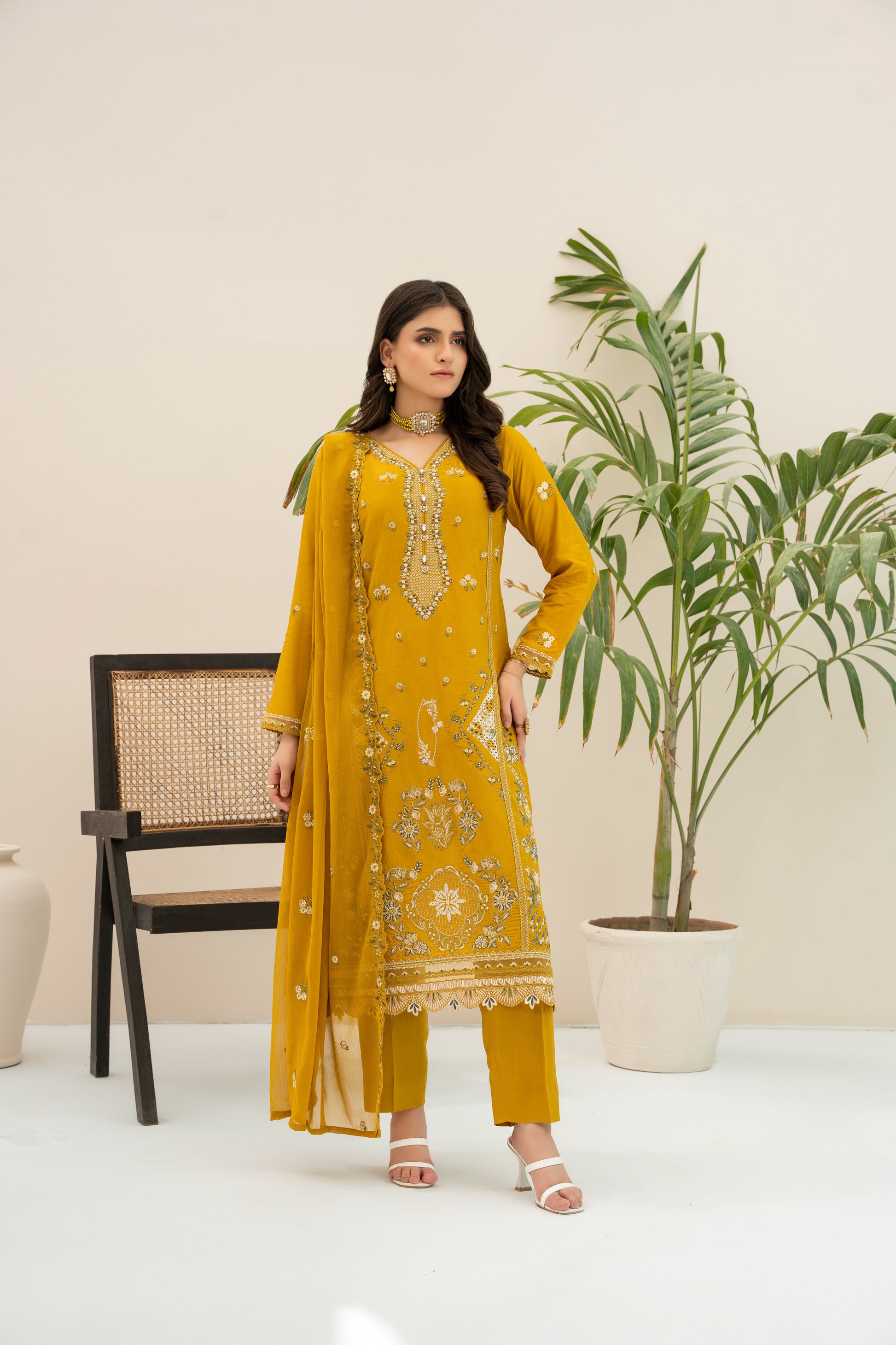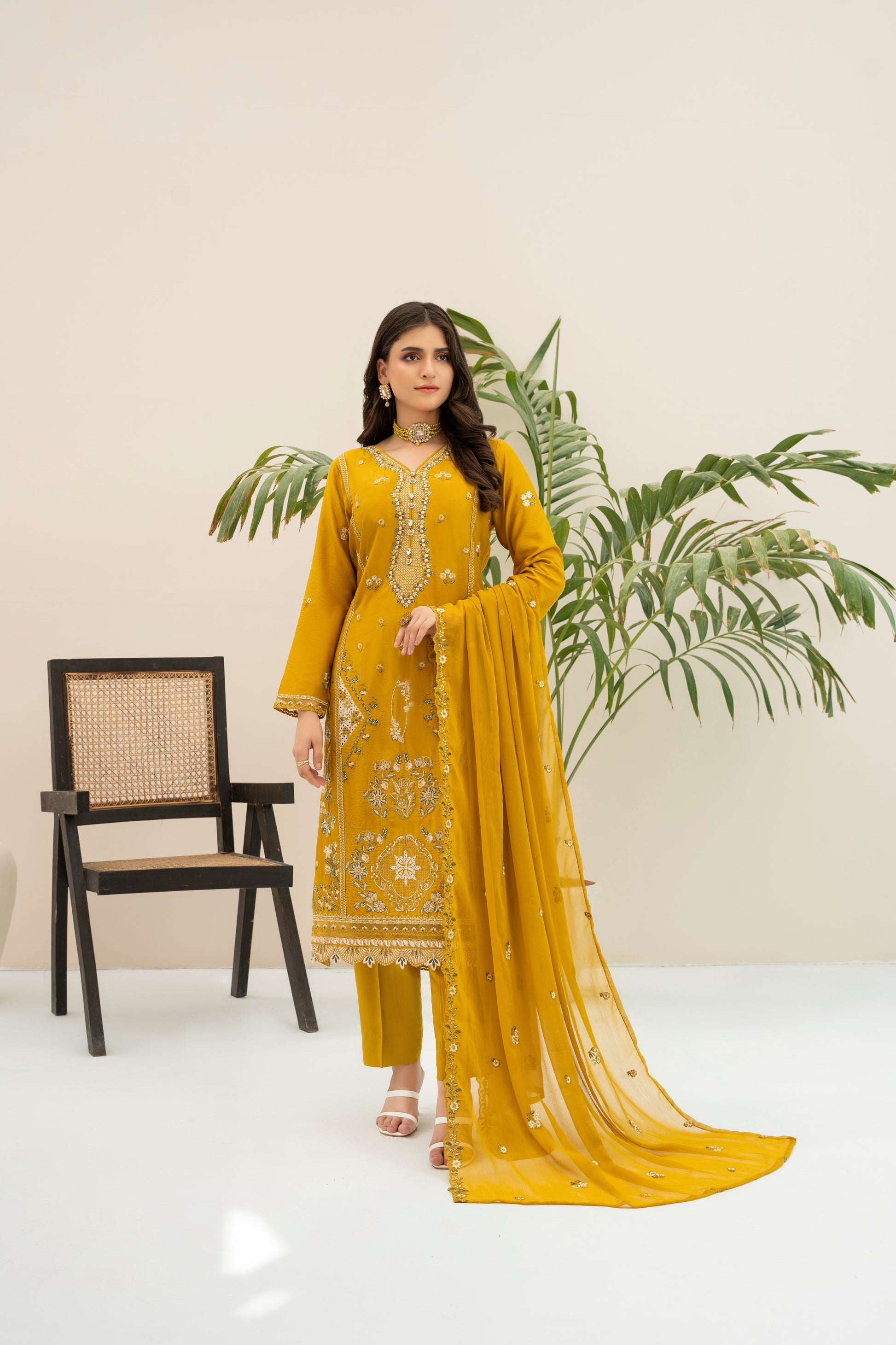 Fabric: Embroidered Viscose shirt with hand-made neckline, embroidered matha-patti cutwork Chiffon dupatta, plain Viscose trouser