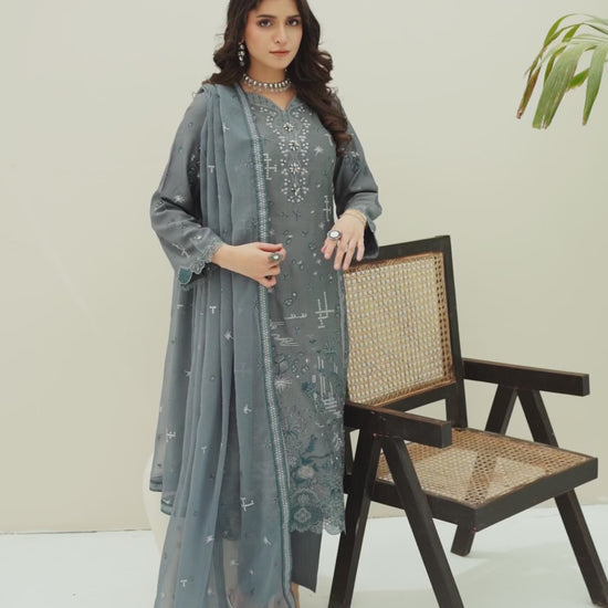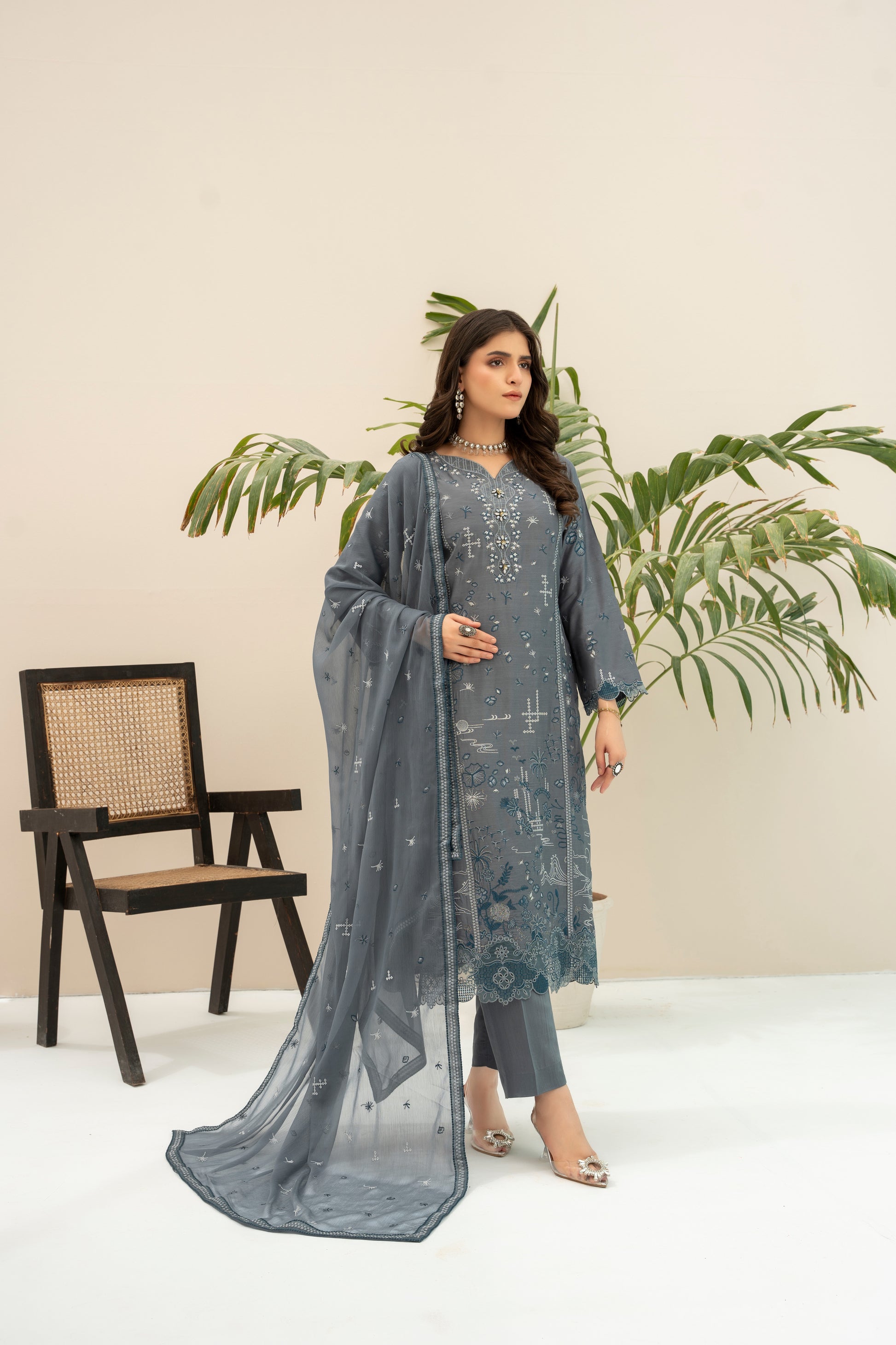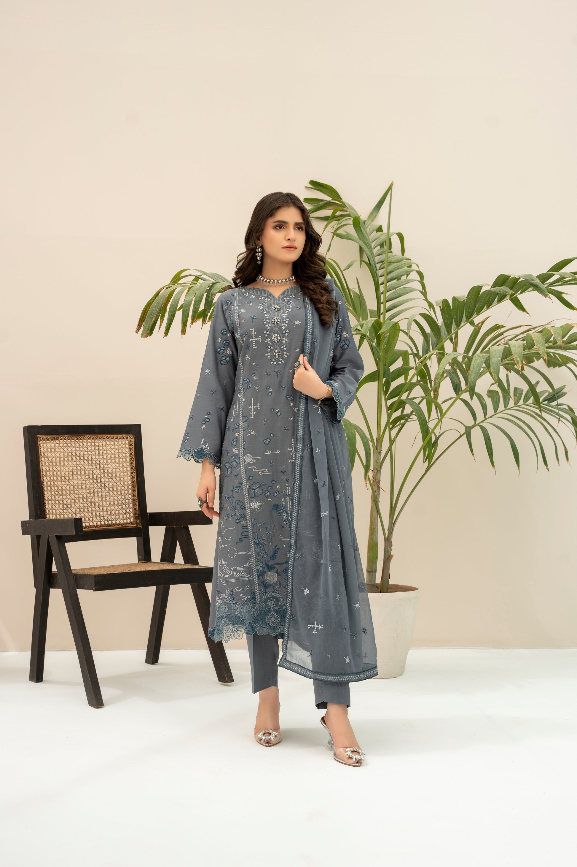 Fabric: Embroidered Viscose shirt with hand-made neckline, embroidered Chiffon dupatta, plain Viscose trouser