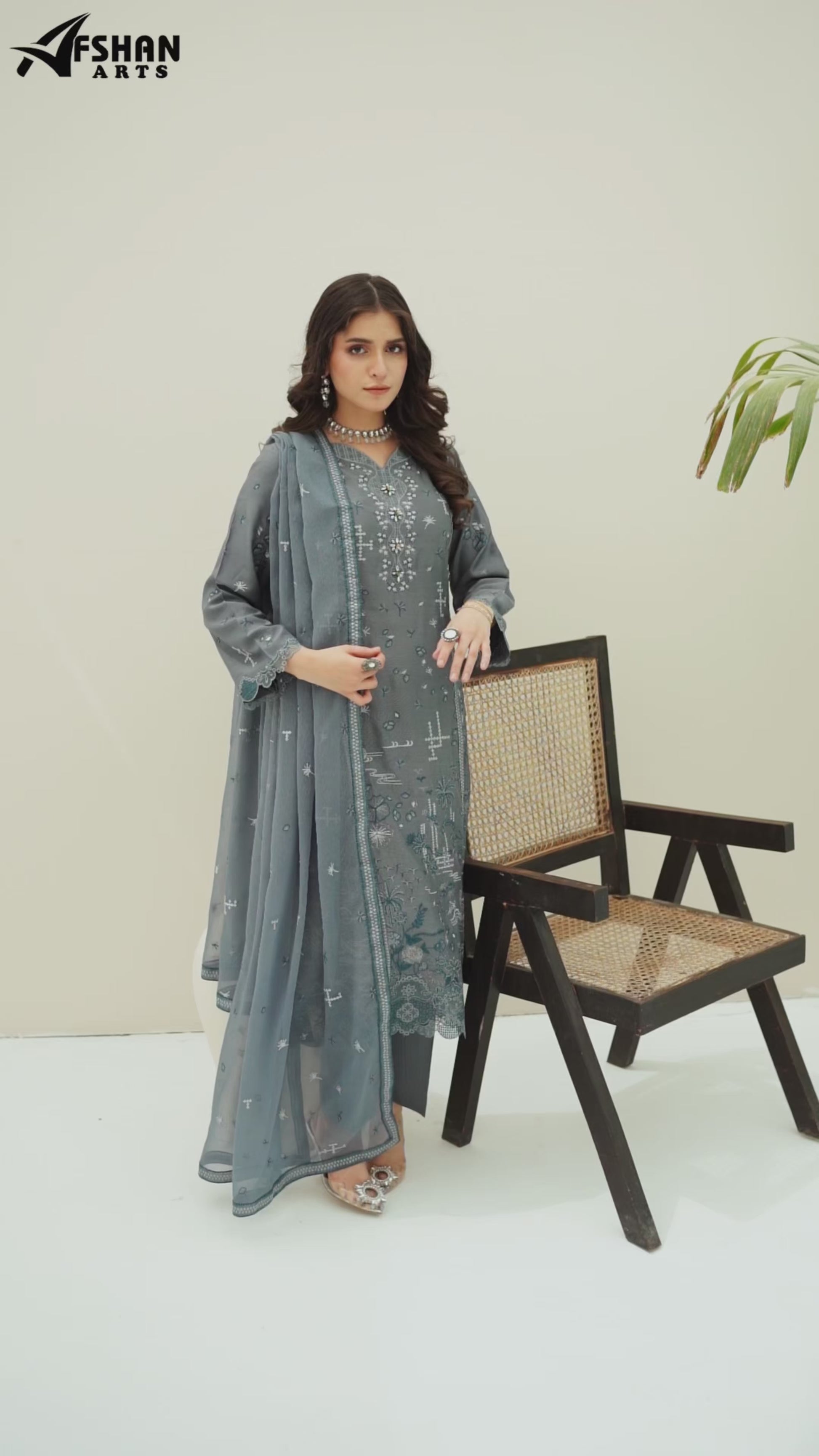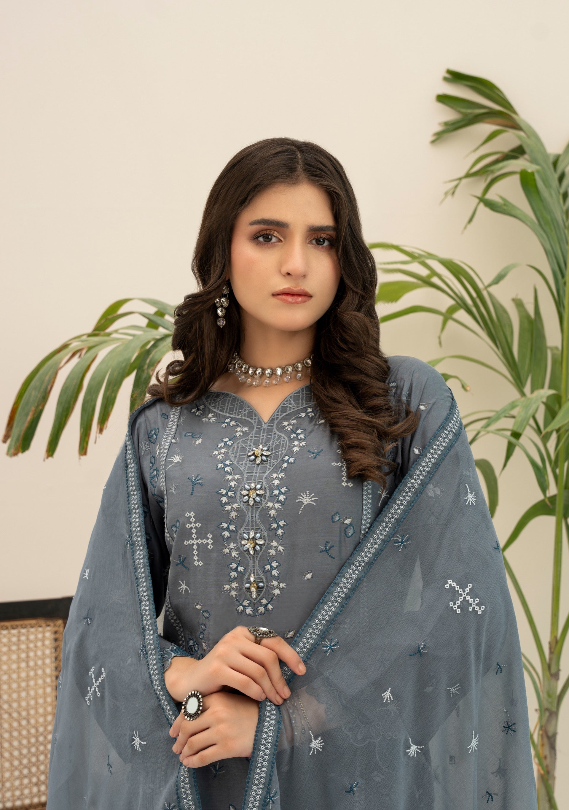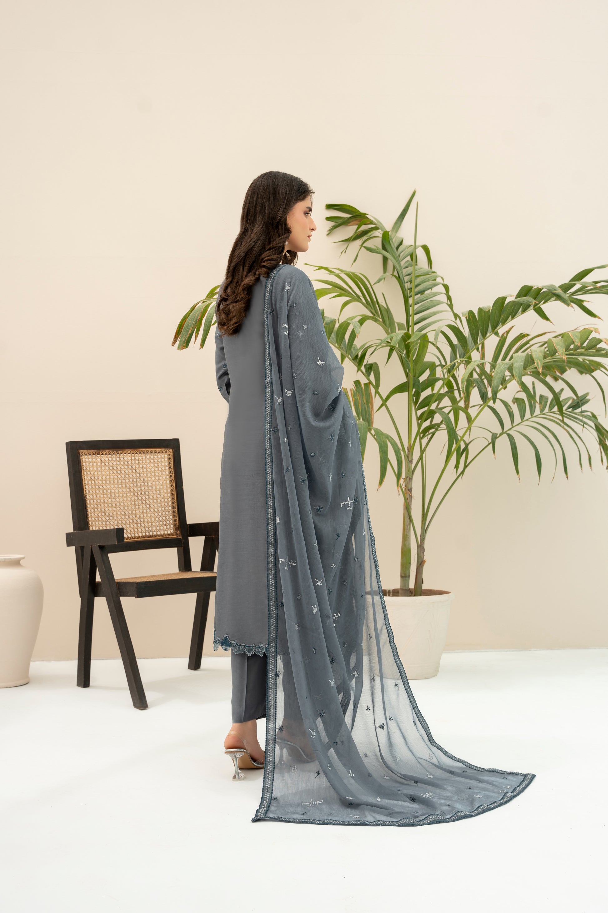 Fabric: Embroidered Viscose shirt with hand-made neckline, embroidered Chiffon dupatta, plain Viscose trouser