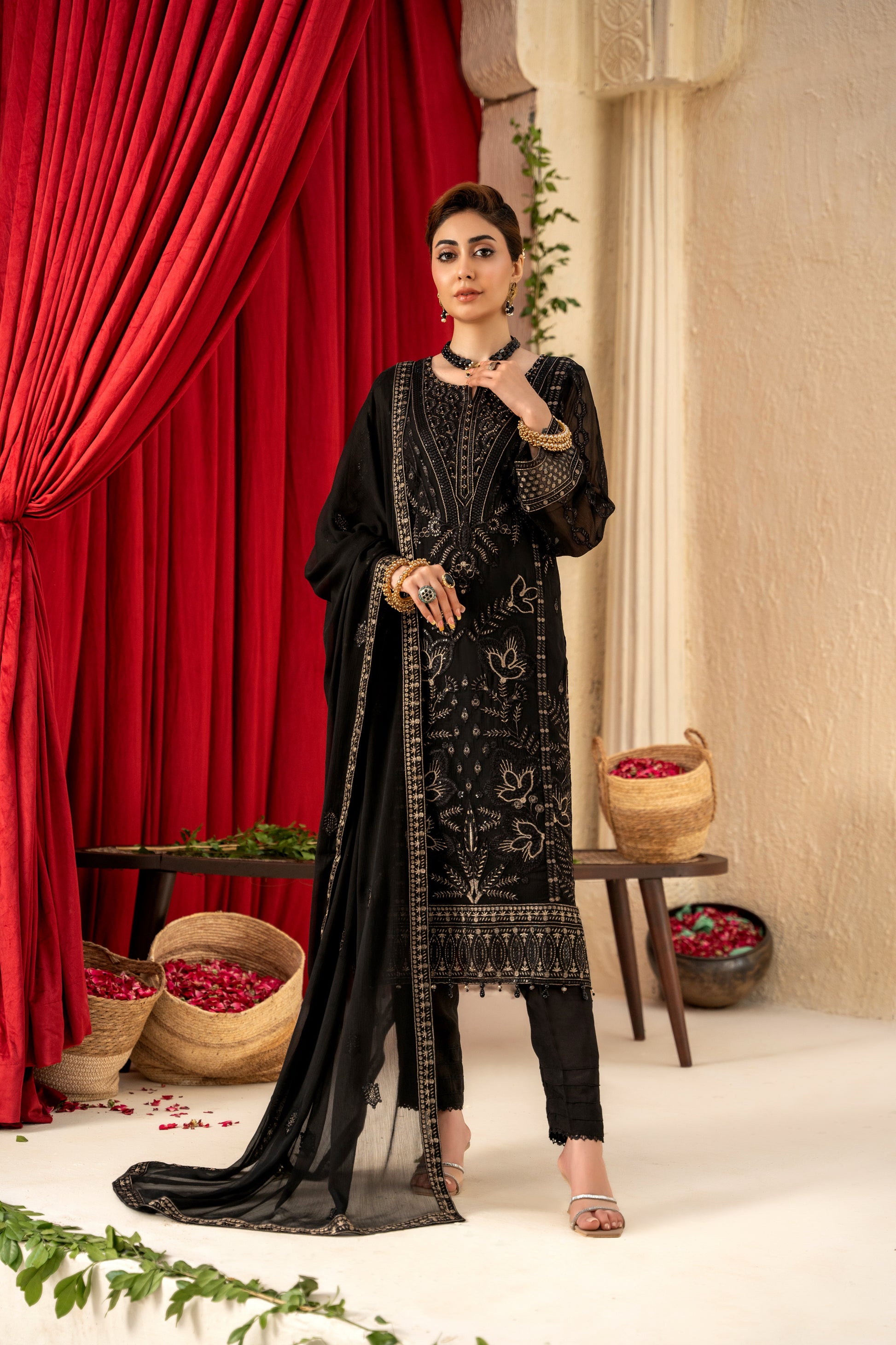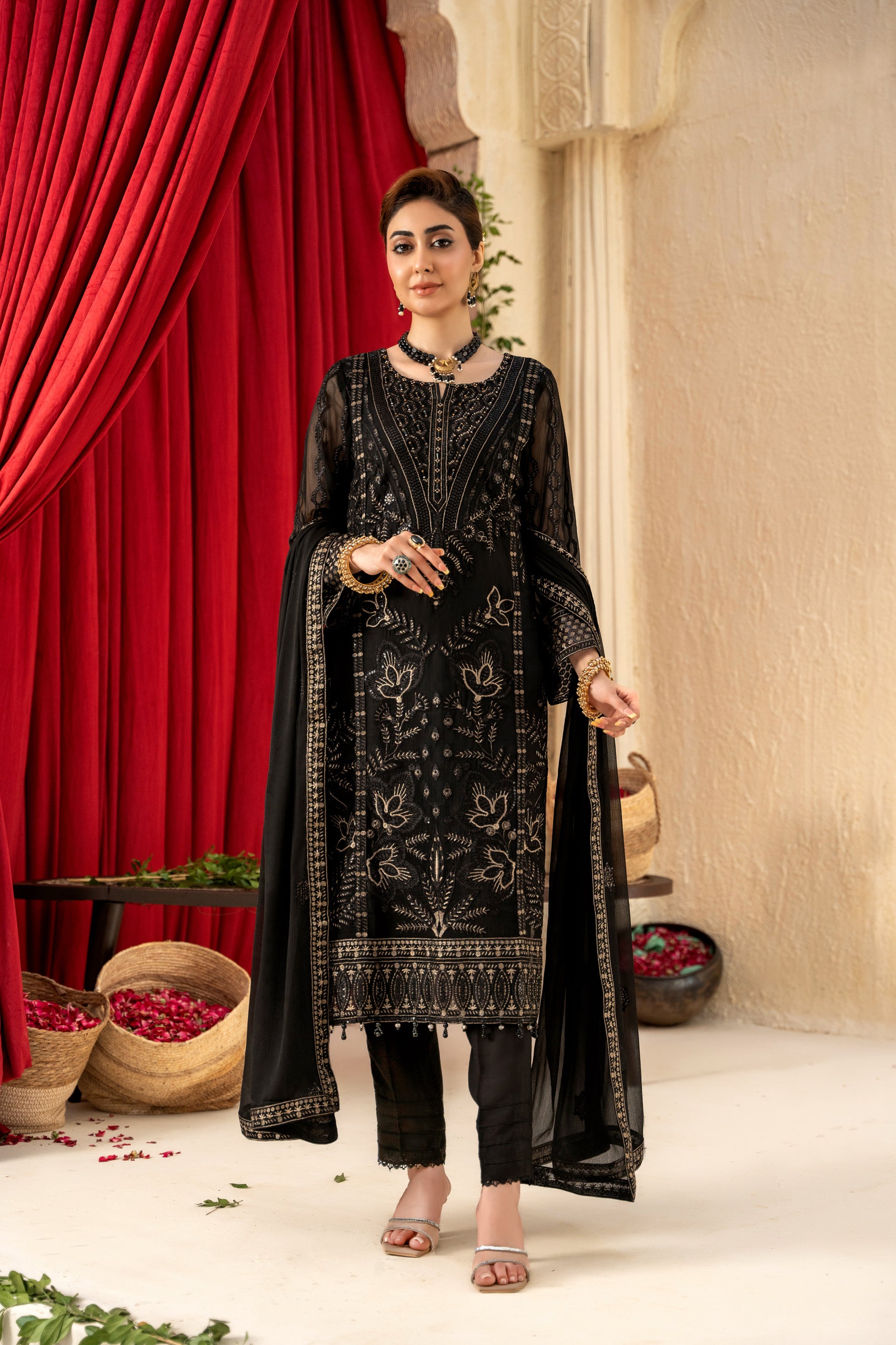 Fabric: Embroidered Chiffon Shirt, Embroidered Chiffon Dupatta, Same Dyed Rawsilk Trouser