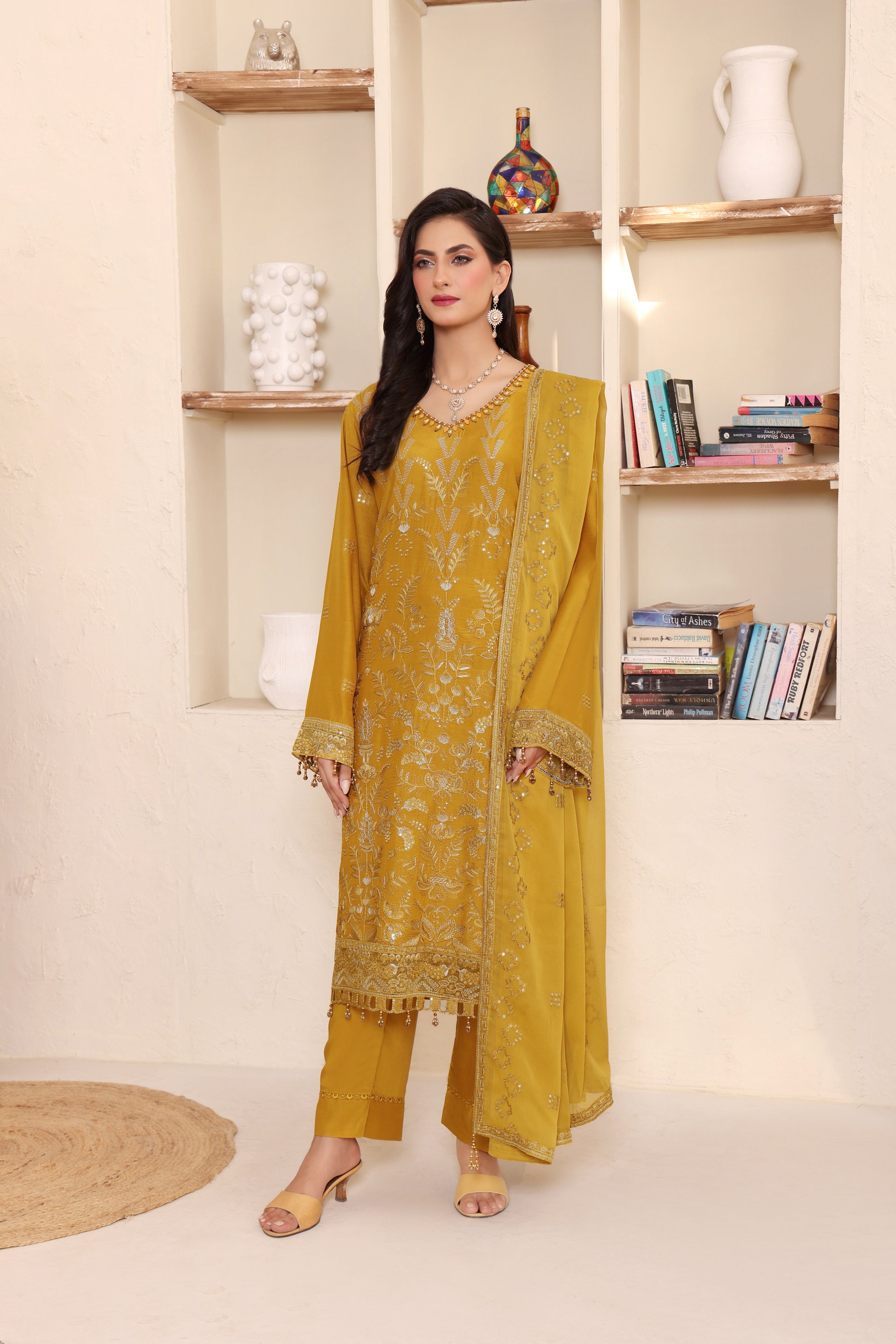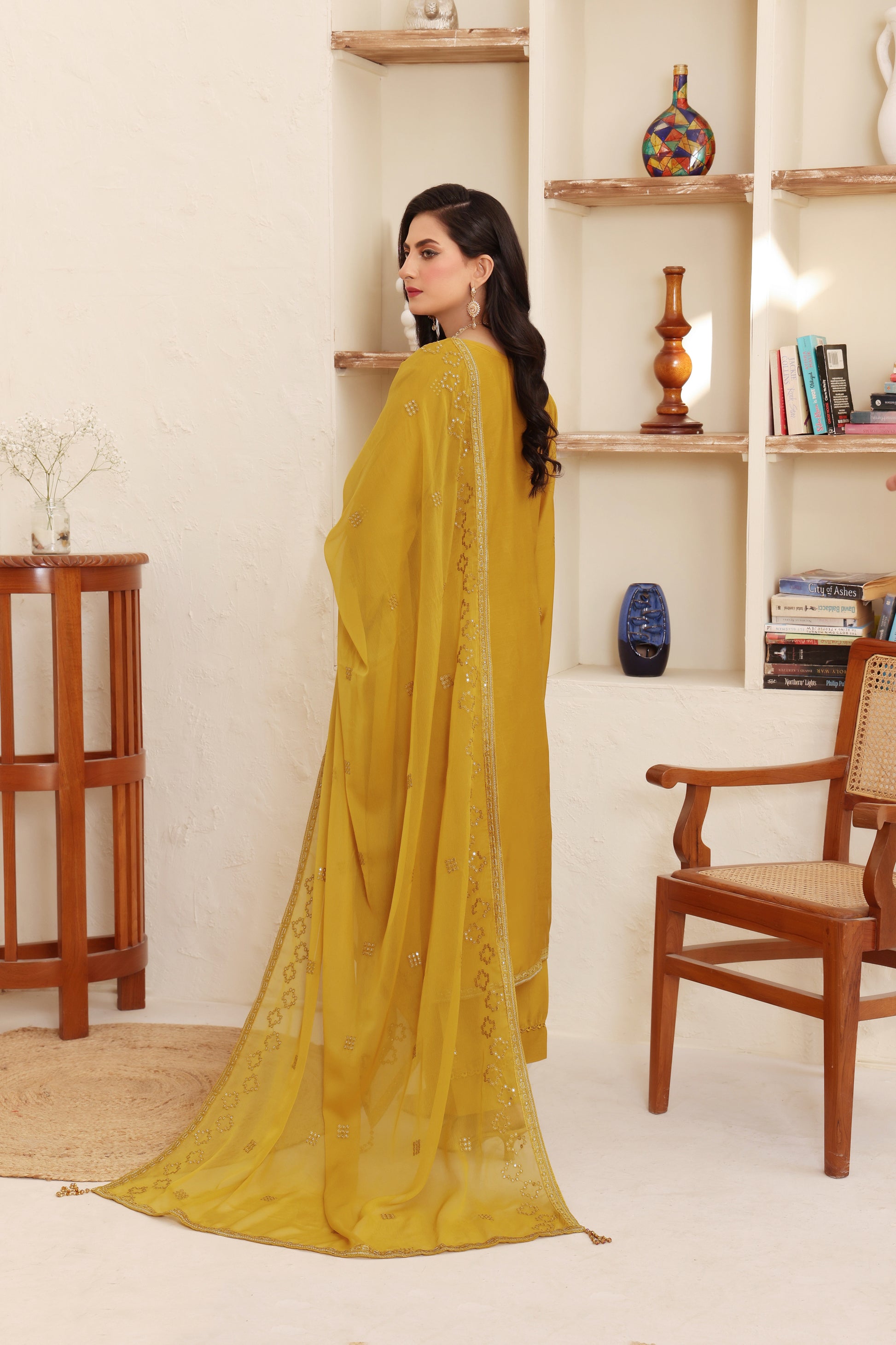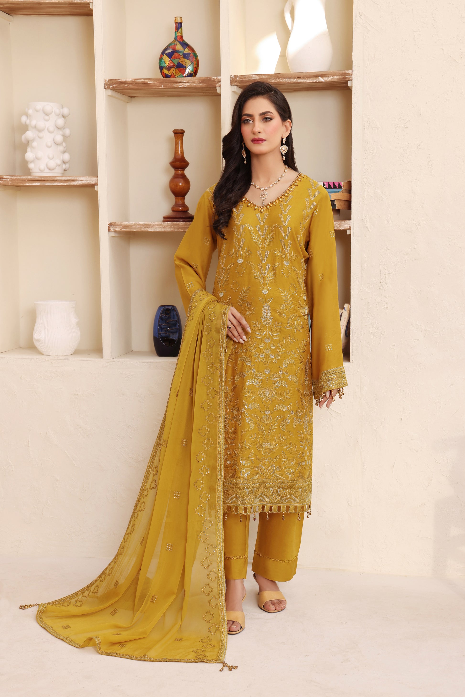 Fabric: Embroidered Viscose Shirt with Hand-Embellishments, Embroidered Chiffon dupatta, Plain Viscose trouser