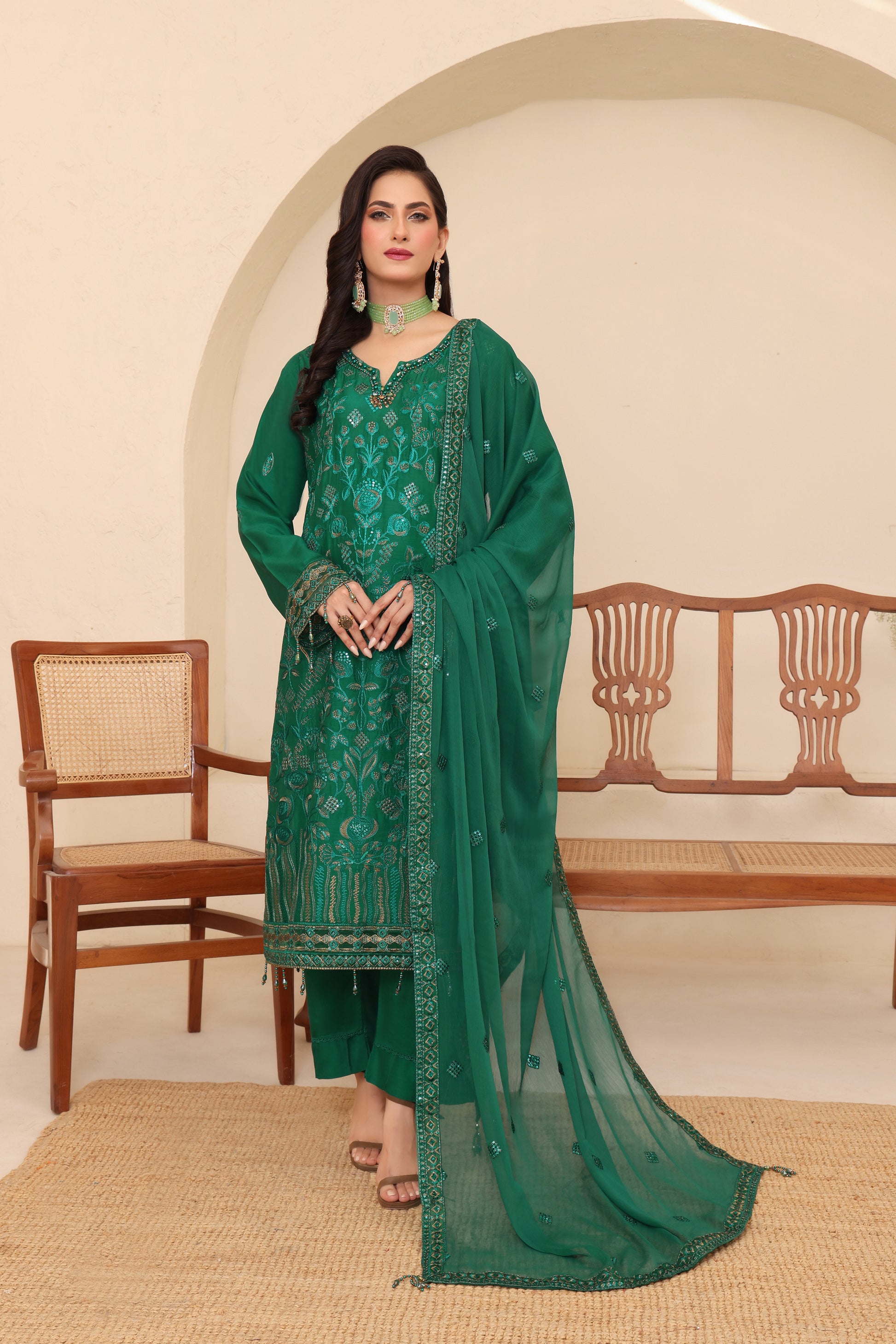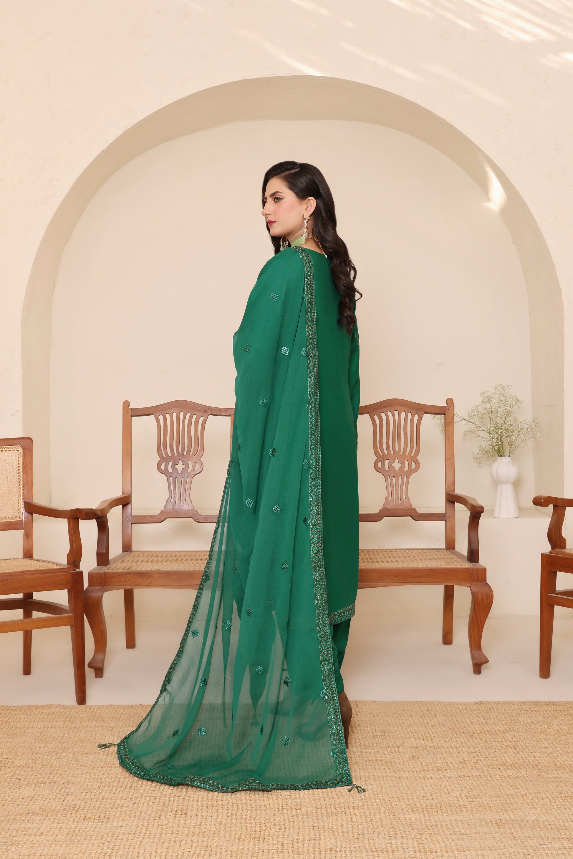 Fabric: Embroidered Viscose Shirt with Hand-Embellishments, Embroidered Chiffon dupatta, Plain Viscose trouser