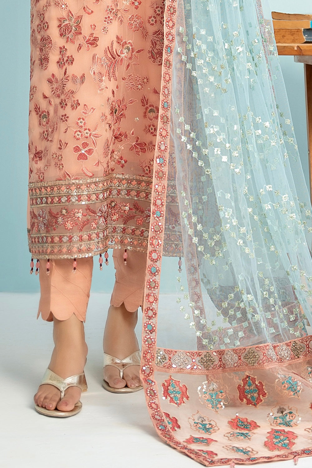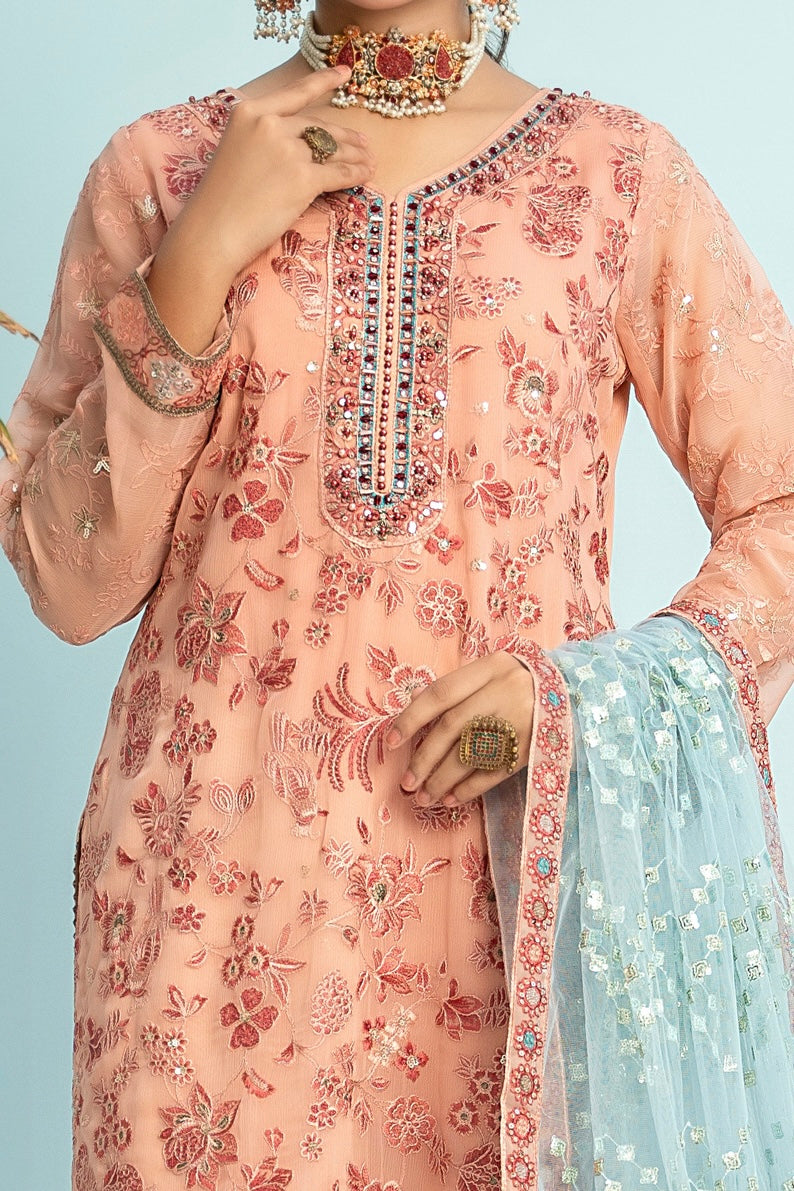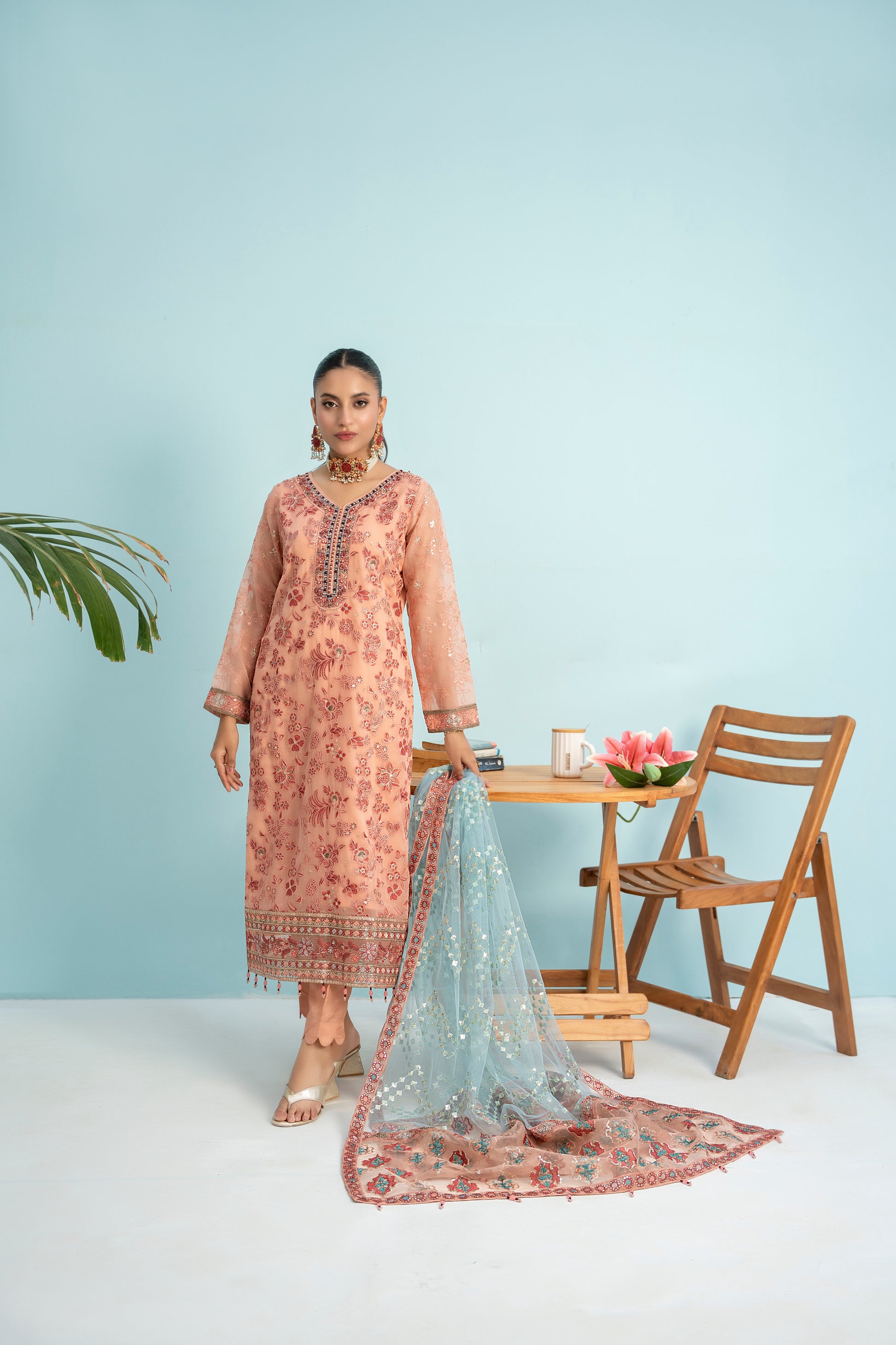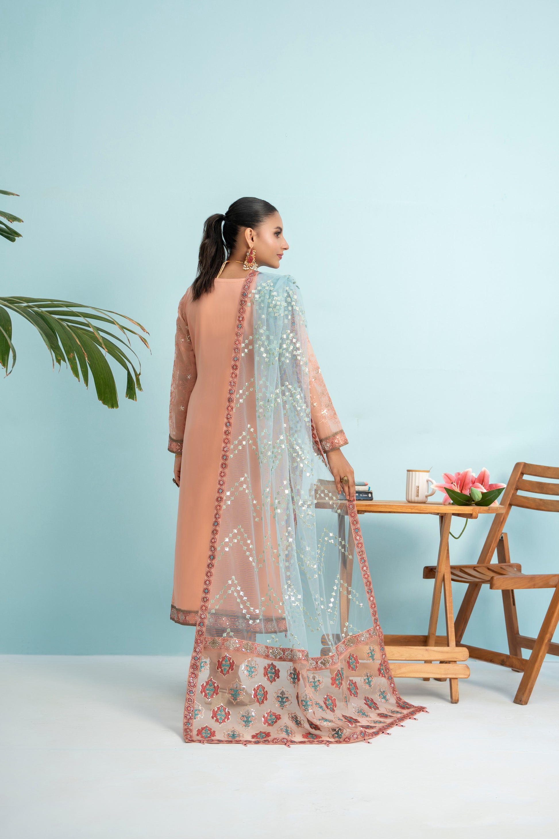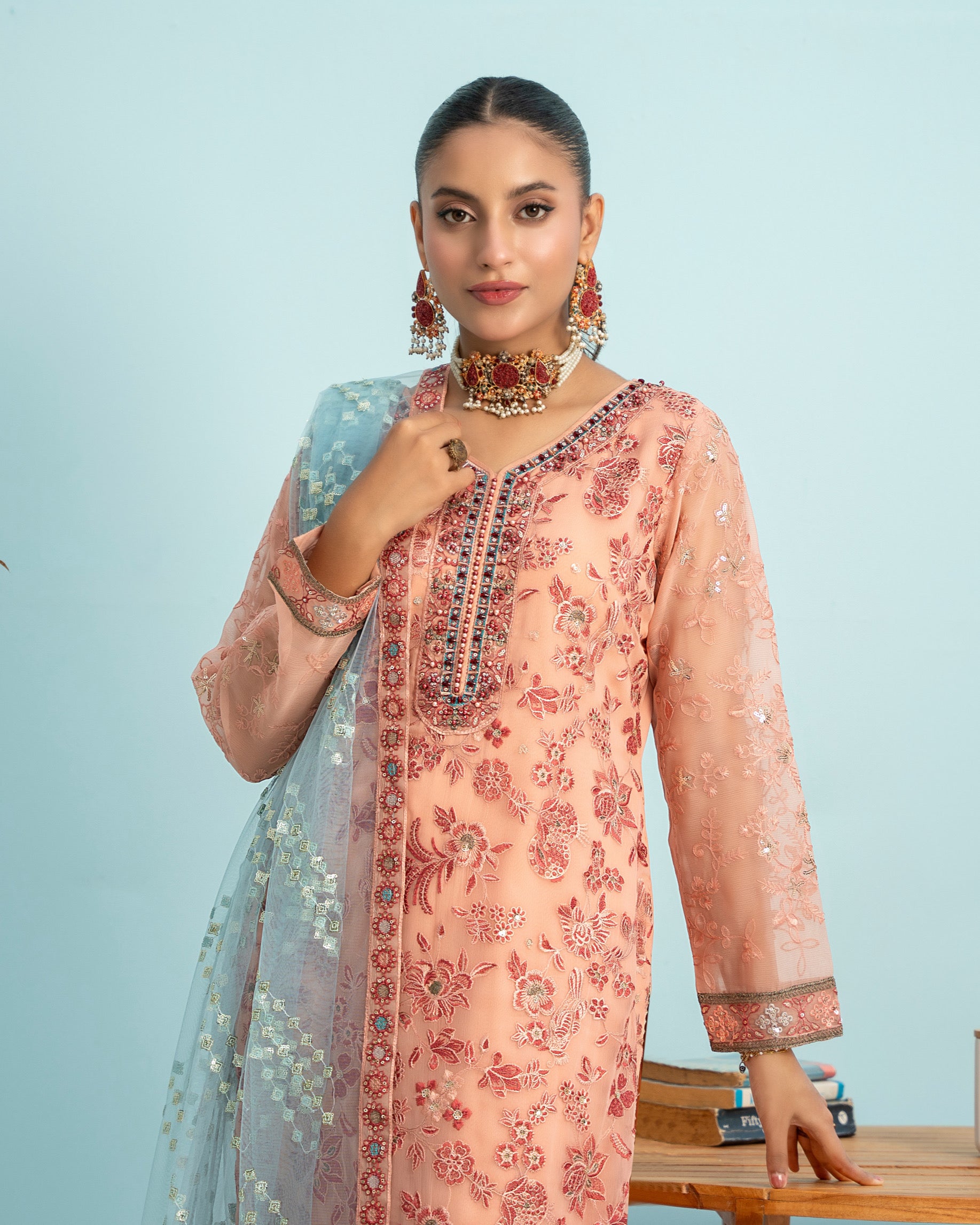 Fabric: Embroidered Chiffon Shirt, Embroidered Net Dupatta, Same Dyed Rawsilk Trouser